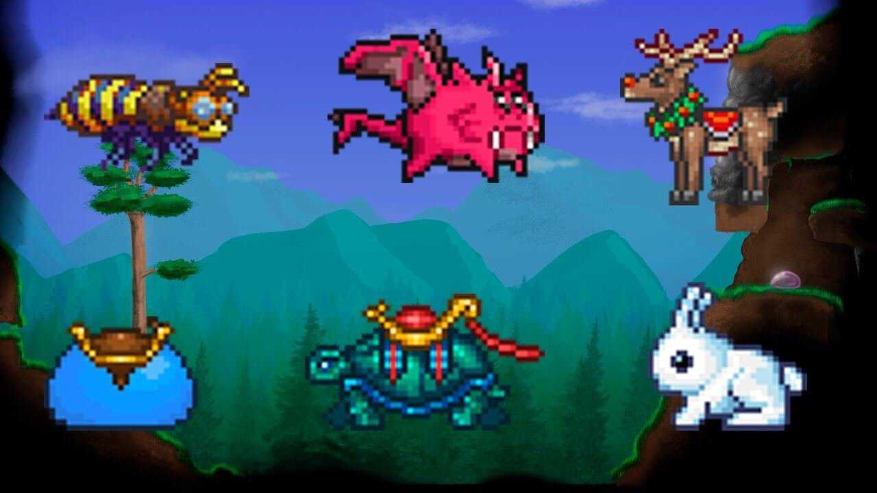 Динозавр / Шершень / Кролик / Попугай / Ящерица / Пингвинёнок / Черепаха / Паук / Черный котёнок / Щенок / Рыба-зефир / Тыковка / Деревце (Проклятое деревце) / Малыш Гринч / Мини-минотавр / Лицемонстрик / Пожиратель душ / Тики-дух / Трюфель-малыш / Пружинный глаз / Скелетрон-малыш / Малыш-снеговик / Оборотень / Слизень / Зомби / Летучая мышь / Морская свинка / Купидон / Эльф / Андроид / Червь / Старушка / Дрон / Индейка / Лепрекон / Золотая черепаха.
