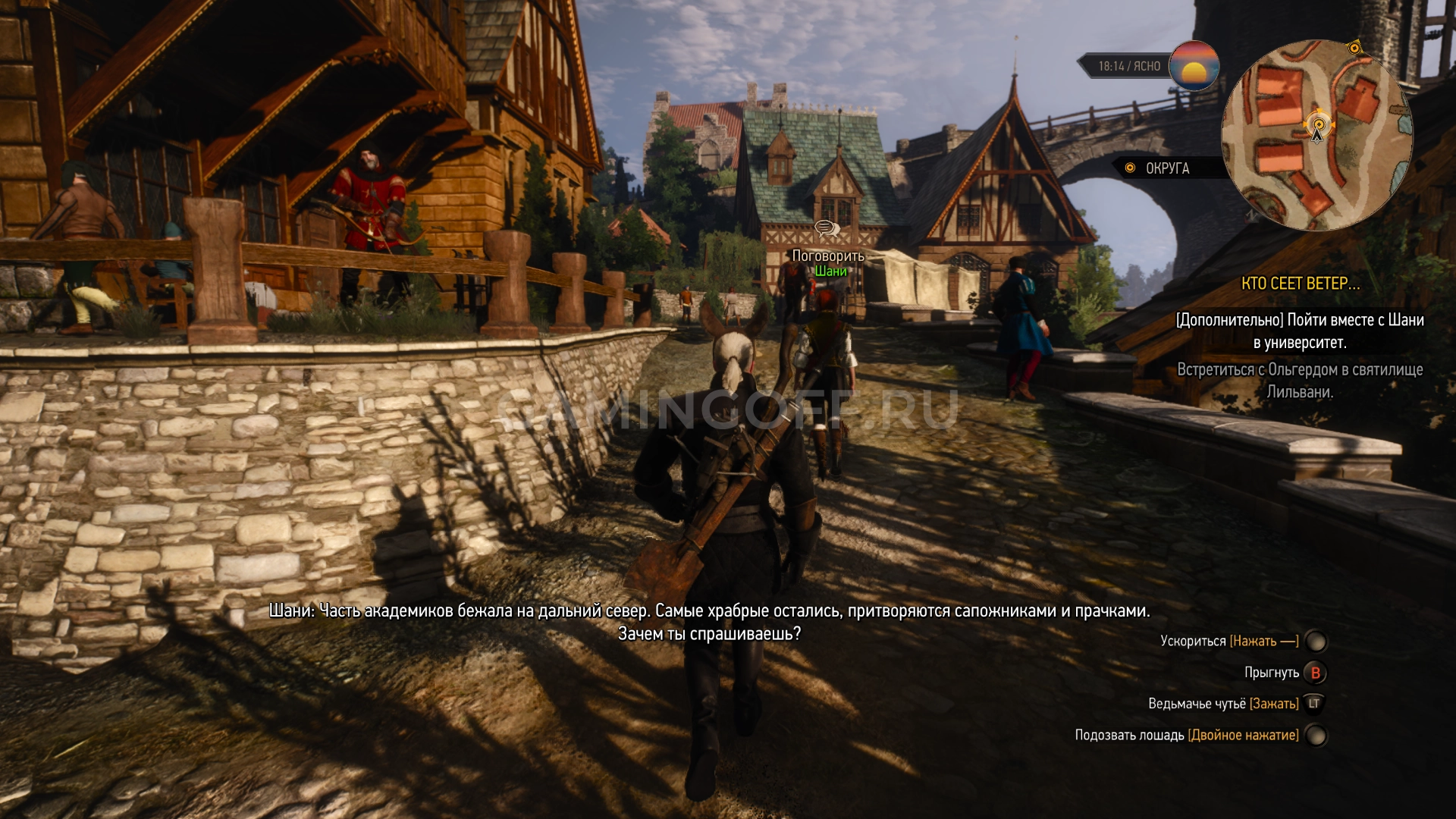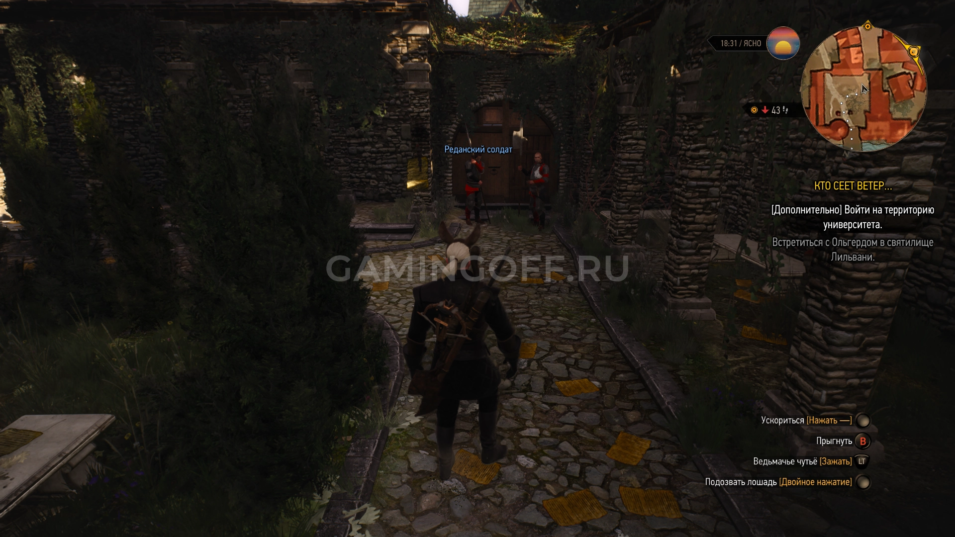 Следуйте за девушкой, но у входа в университет стража не пустит Геральта.