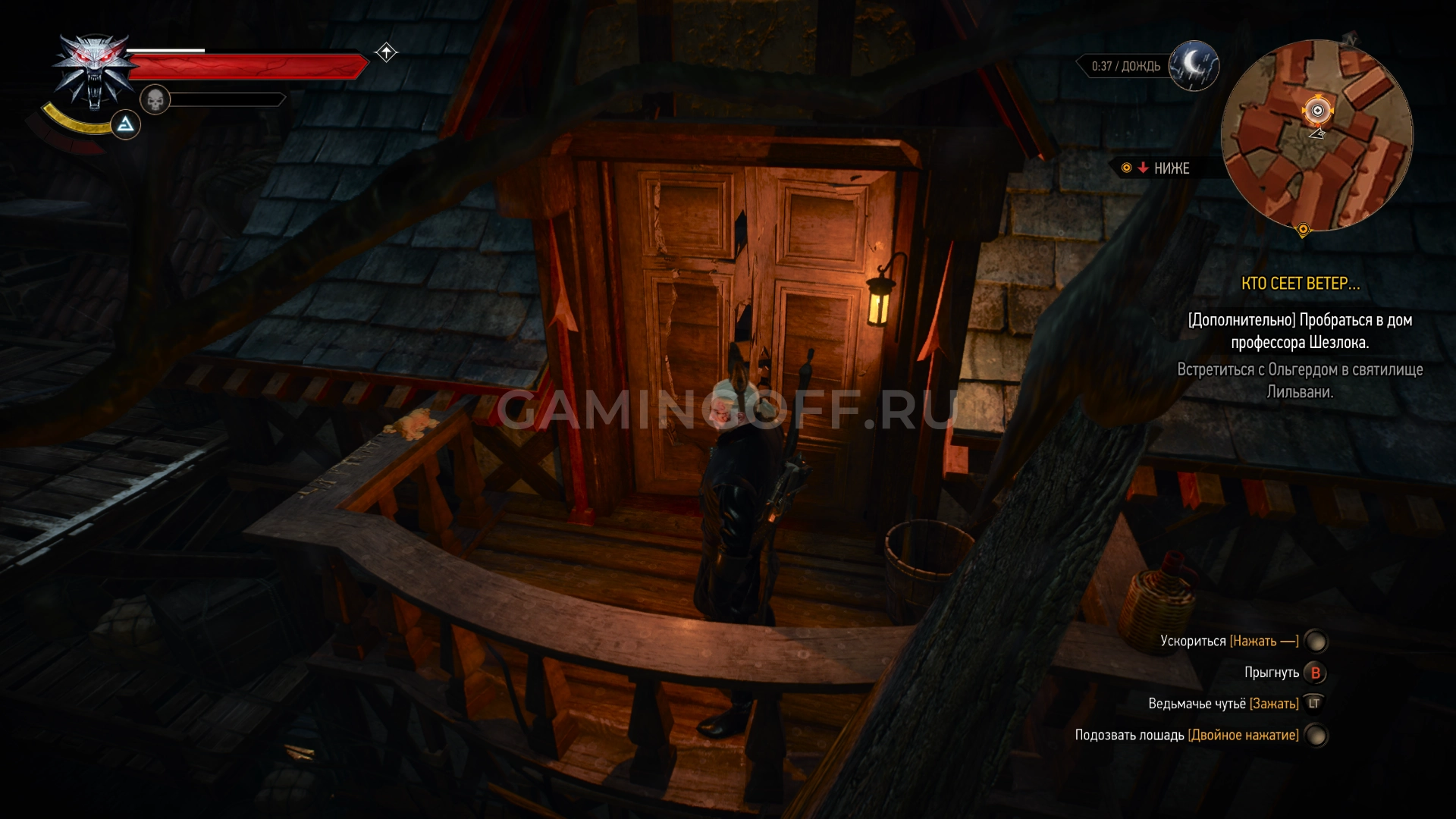 С этого места вы сможете добраться до наклонной крыши справа, а затем до балкона(рисунок выше). Используйте знак Aard на деревянной двери и войдите внутрь. Спуститесь по лестнице влево и посмотрите на разрушенное зеркало на земле . Затем прочитайте книгу на столе справа.