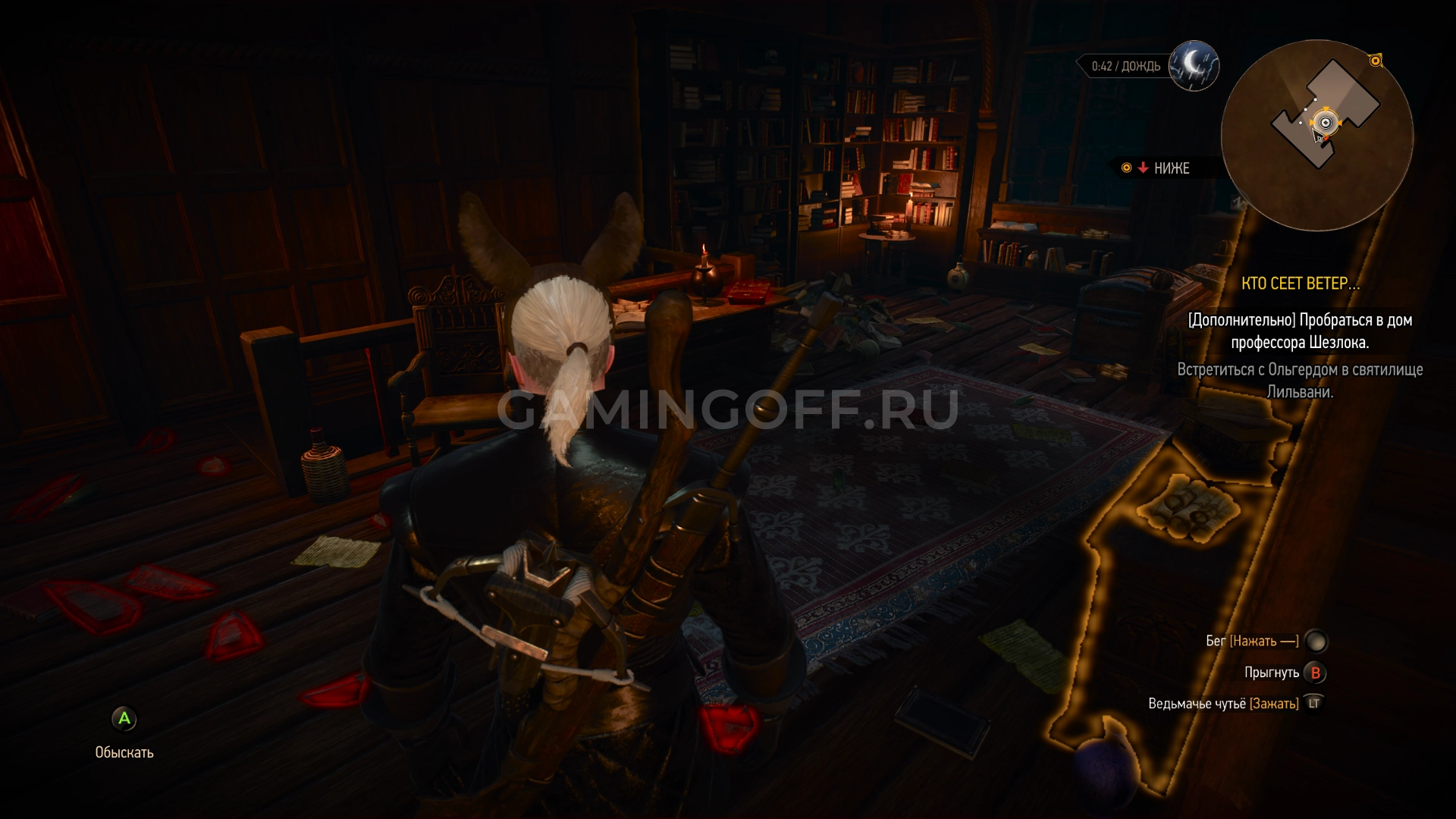 Спускайтесь по лестнице, осмотрите прямо от лестницы «Серебряный Ламен», на полу зеркало, а на столе книгу. Спускайтесь на первый этаж, там будет профессор, расспросите его об Ольгерде и о’Диме. Когда закончите, осмотрите его тело и заберите ключ от дома.