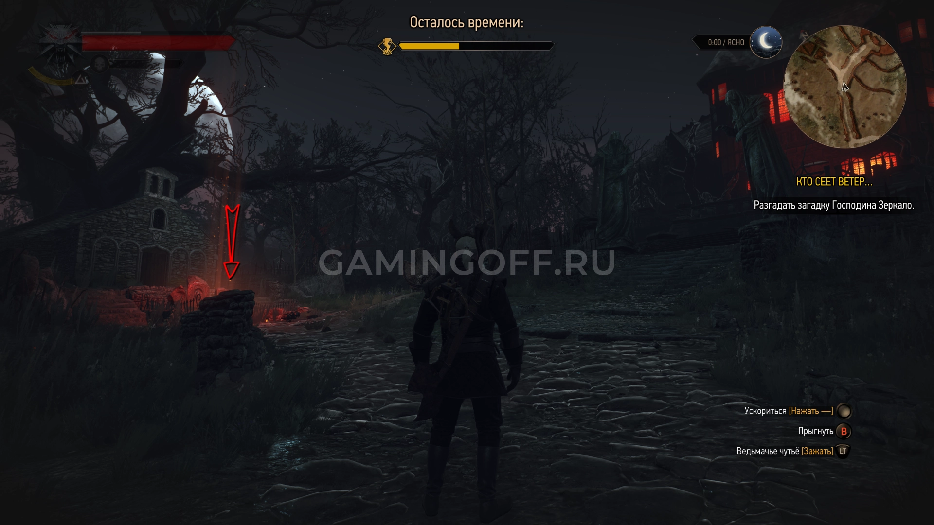 Выходите и бегите снова направо, к дому. Слева у склепа осмотрите могилу. Далее убедитесь, что у вас много здоровья, так как войдя в дом и добежав до зеркала, ведьмак упадет вниз и у него отнимется ровно половина здоровья.