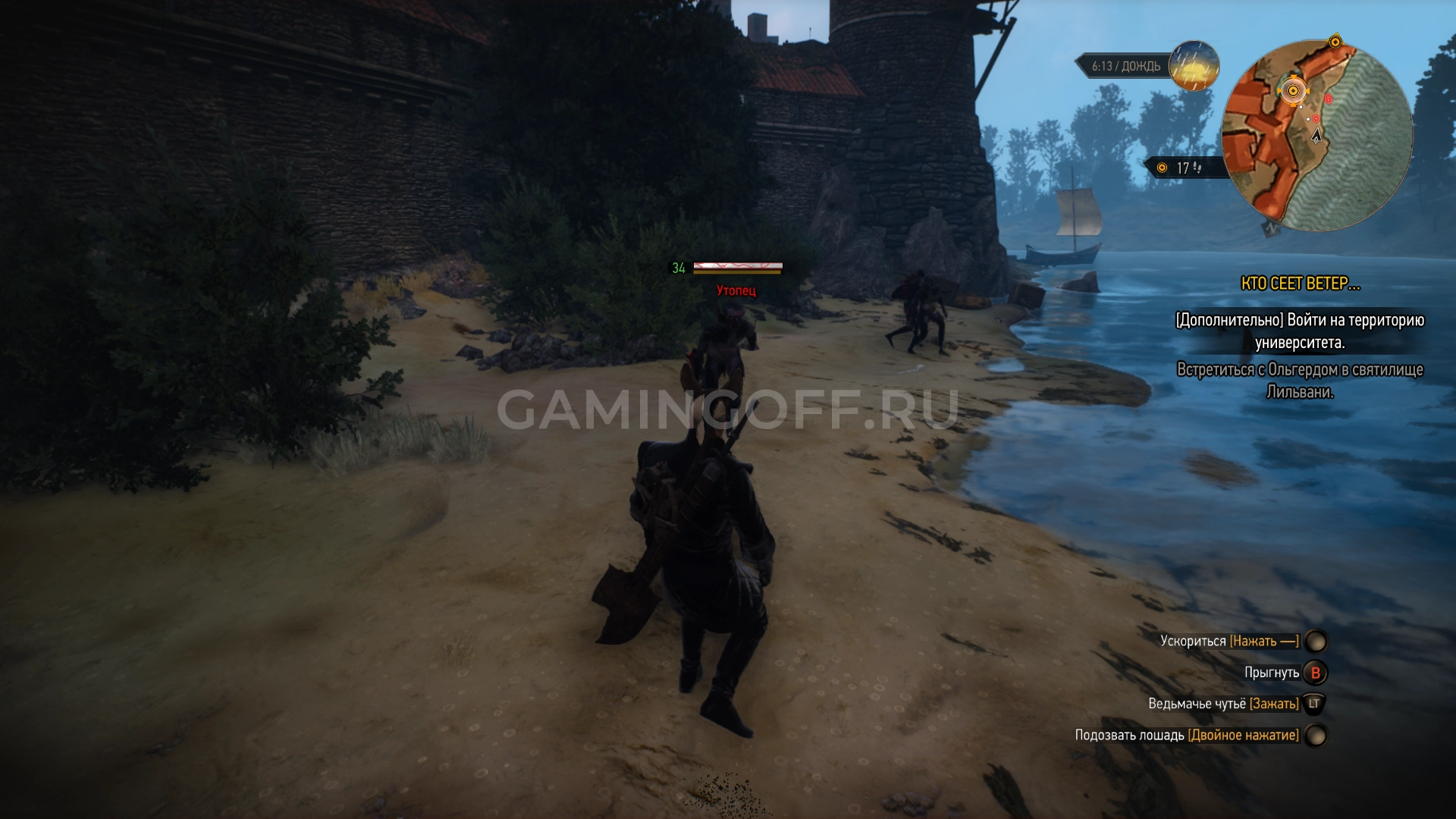 Спрыгните с моста в воду, затем выплывите на берег к стенам, затем бегите к точке на карте. Перед местом, вас будут ждать утопцы.