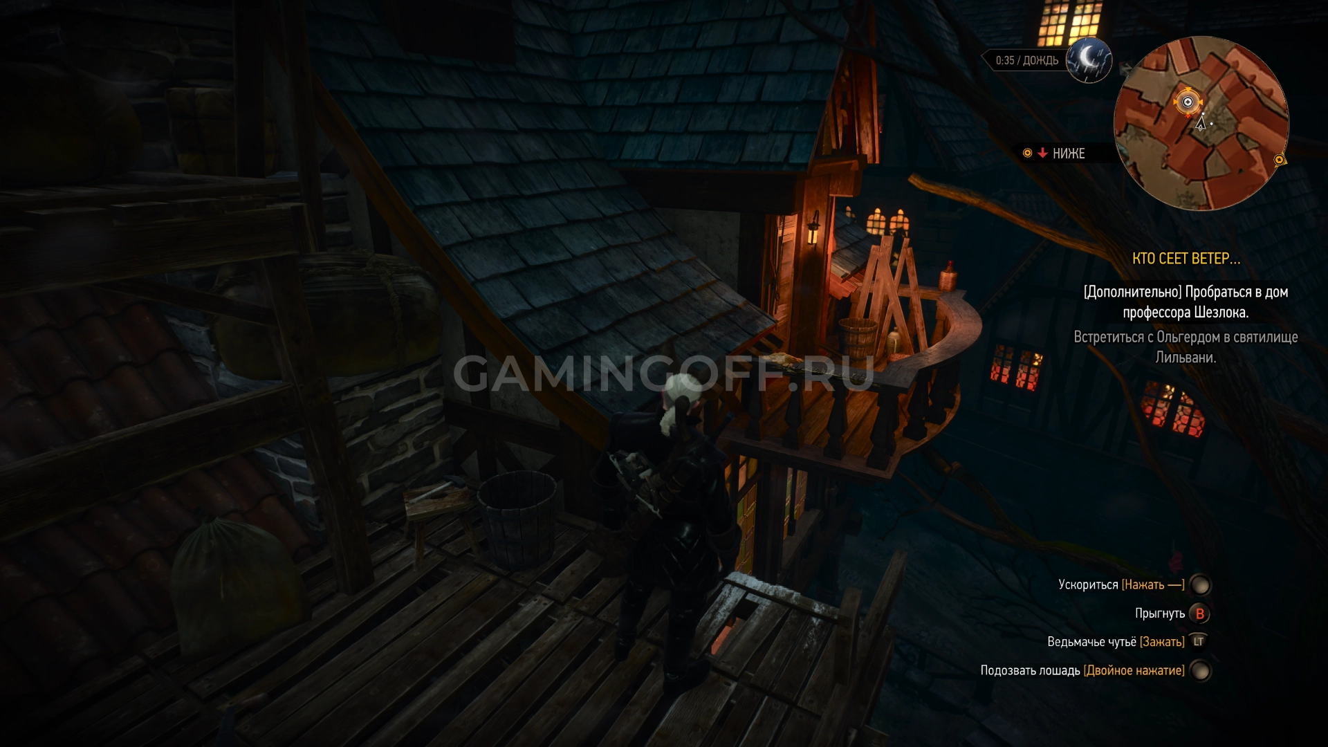 Идите направо, убейте некоторых дождей на пляже и идите к стене (рисунок выше), где Шани даст вам веревку. Идите наверх и идите направо. Пообщайтесь с некоторыми охотниками за ведьмами и войдите в здание, где находится профессор Szezlock .