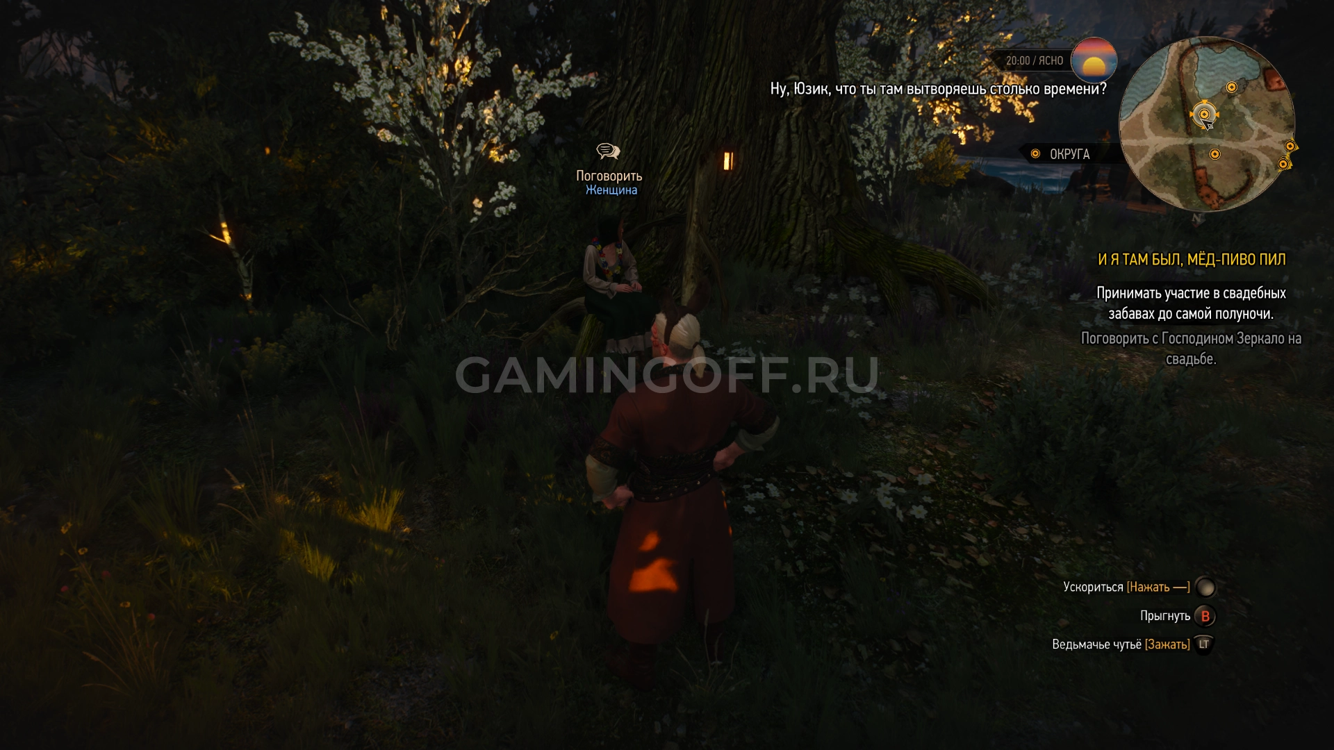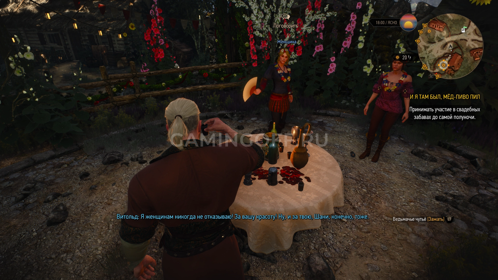 Во время диалога скажите: «Я бы хотел остаться еще ненадолго». После чего начнется дополнительный квест «Ясная полночь». Если вы покинете свадьбу, то квест этот квест будет провален!