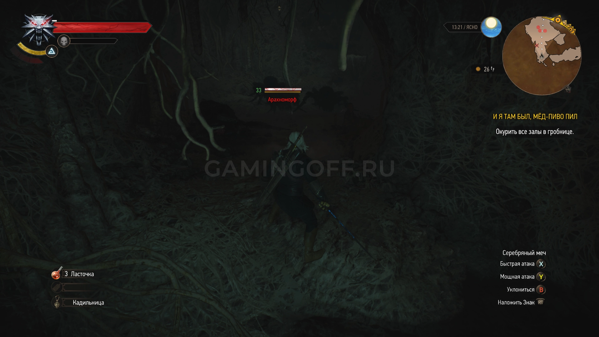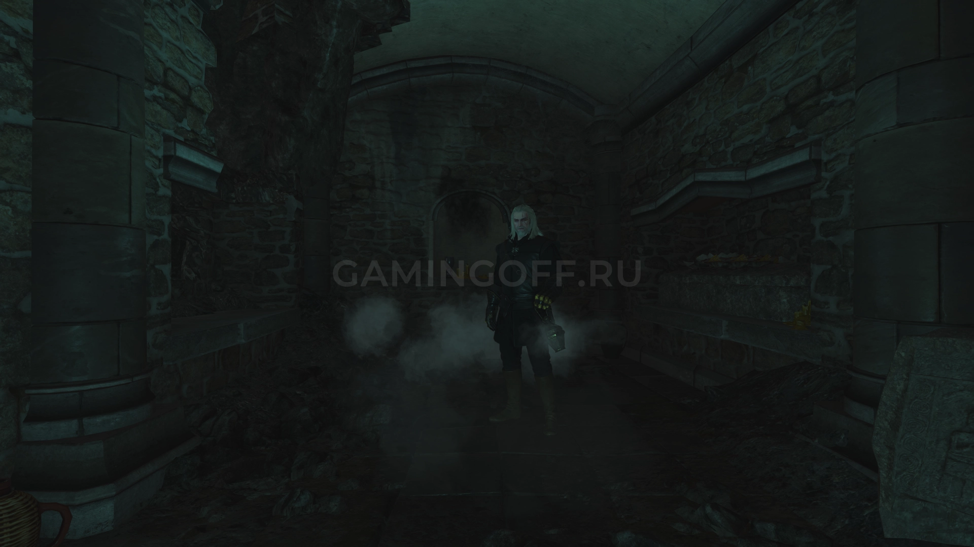 Идите за девушкой до входа в склеп, далее спускайтесь вниз одни. В комнате слева в гробу справа будет ценный предмет. Идите далее, убейте призраков. Осмотрите в центре лампаду, затем справа будет стена, которую можно сломать Аардом. Спрыгивайте вниз и осмотрите труп, у которого вы найдете ключ. Идите по единственному пути, используя чутье, чтобы найти много сундуков и бочек с очень ценным лутом. Далее будет арахноморфы.