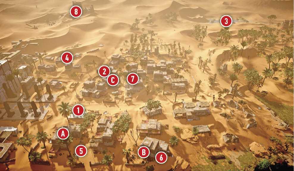 Вернитесь к Рамессу (1). Используйте Сену для поиска трех людей в деревне: (5), (6) и (7).