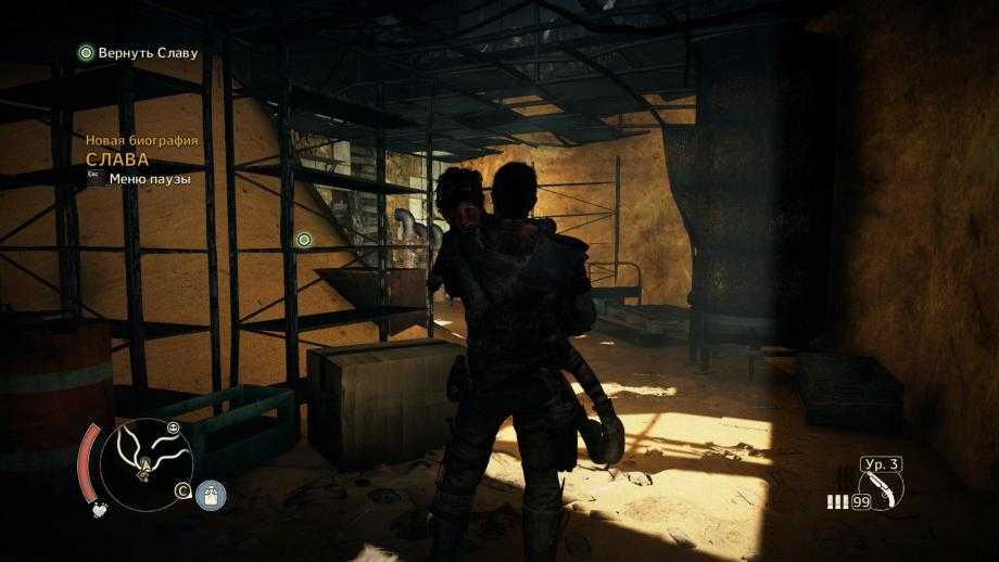 Оказавшись в гараже, мы замечаем «Вождь», а главное, тот самый двигатель который нам нужен. Машину нужно опустить, но, не всё так просто. Бойцы «Помойки» активно охраняют гараж, и заметив Макса резко кидаются в бой. Раскидав всех бойцов, мы находим канистру, находим генератор, заправляем его, опускаем машину. Всё, осталось только отогнать её к храму Фритюра.