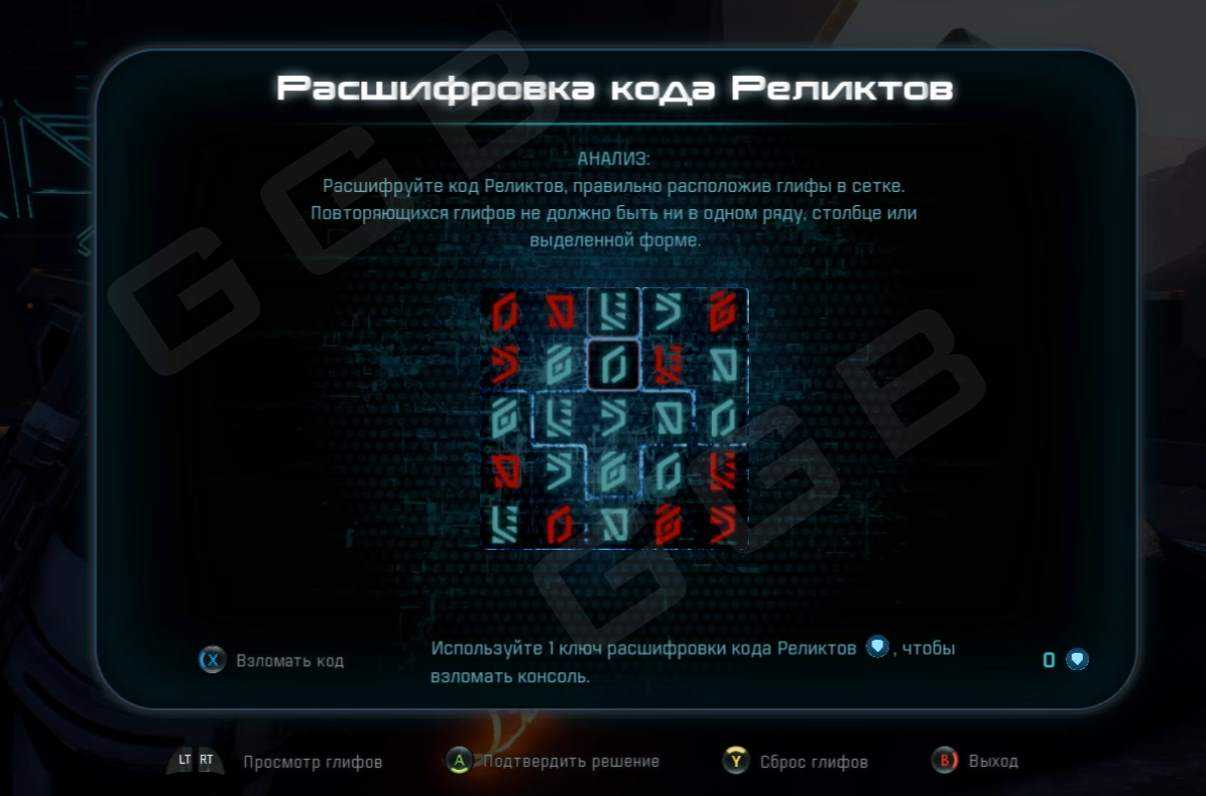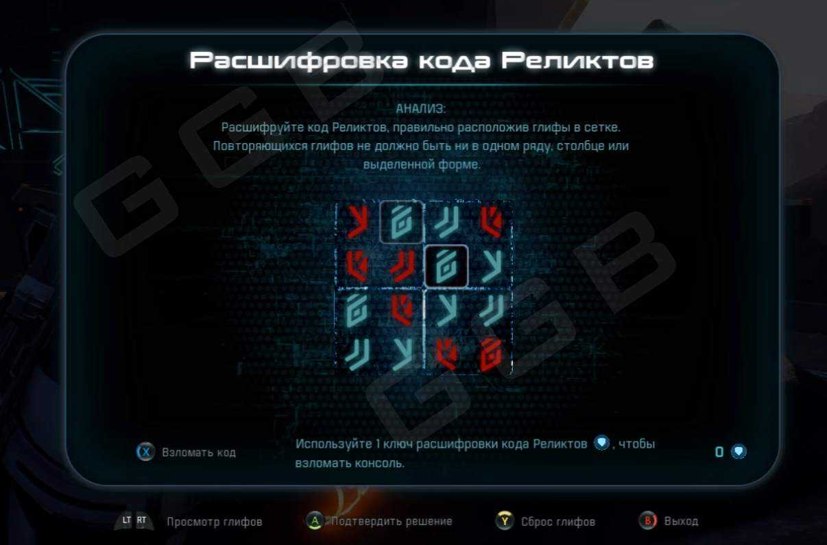Важный момент: если вы неправильно введете по крайней мере один глиф, то рядом появятся враги, с которыми вам придется сразиться, и лишь после этого сможете вернуться к решению головоломки. Ключ расшифровки вы можете использовать для того, чтобы избежать поиска решения глифа, не теряя на этом времени. Тем не менее, такие коды в «Масс Эффект» очень редкие и не всегда с ними можно пройти. Более того, повторно ключ не везде можно будет использовать.