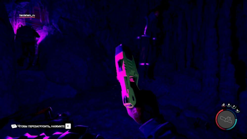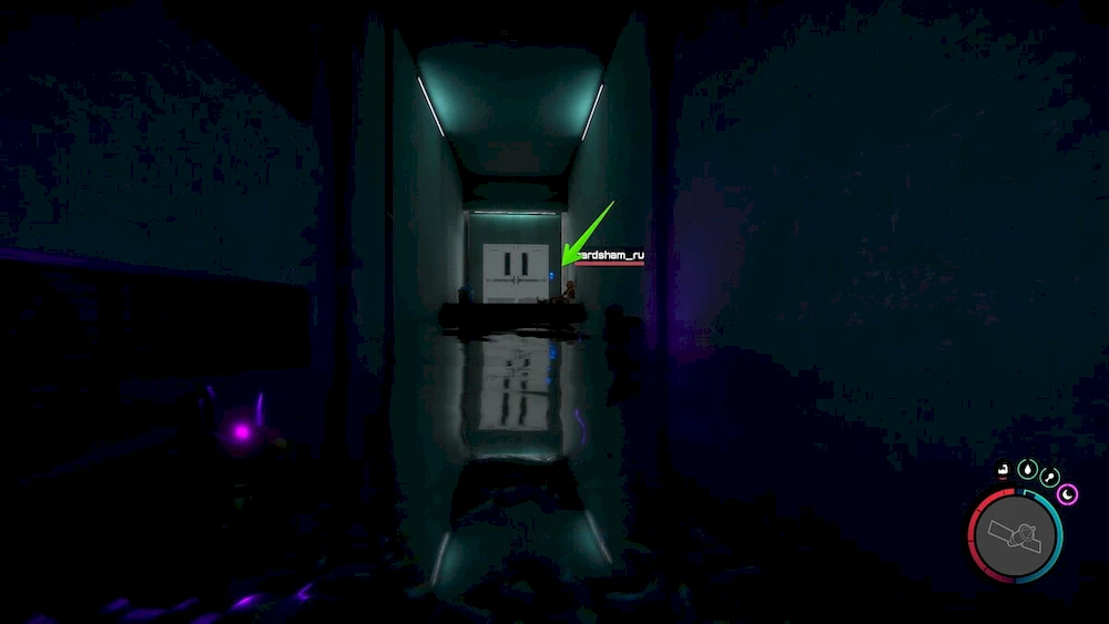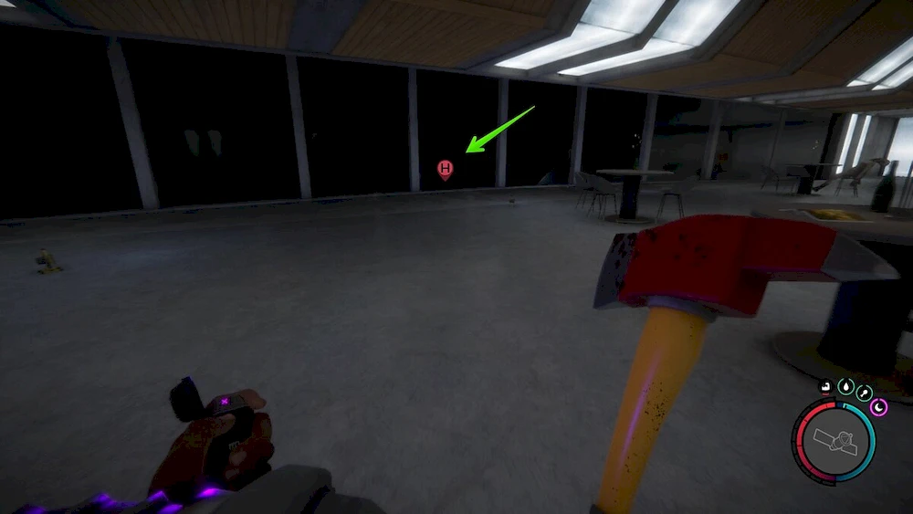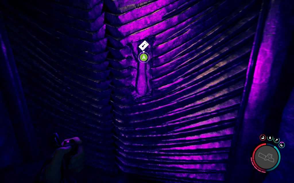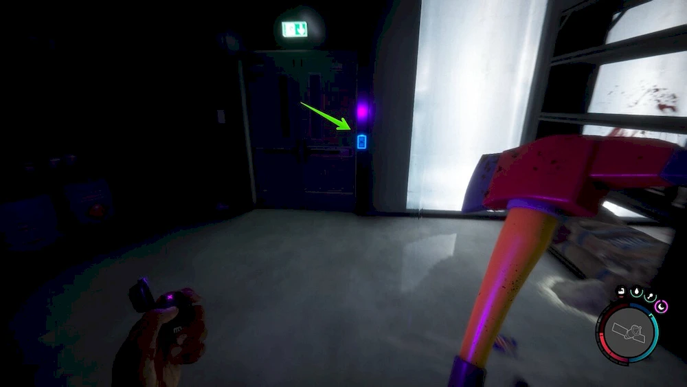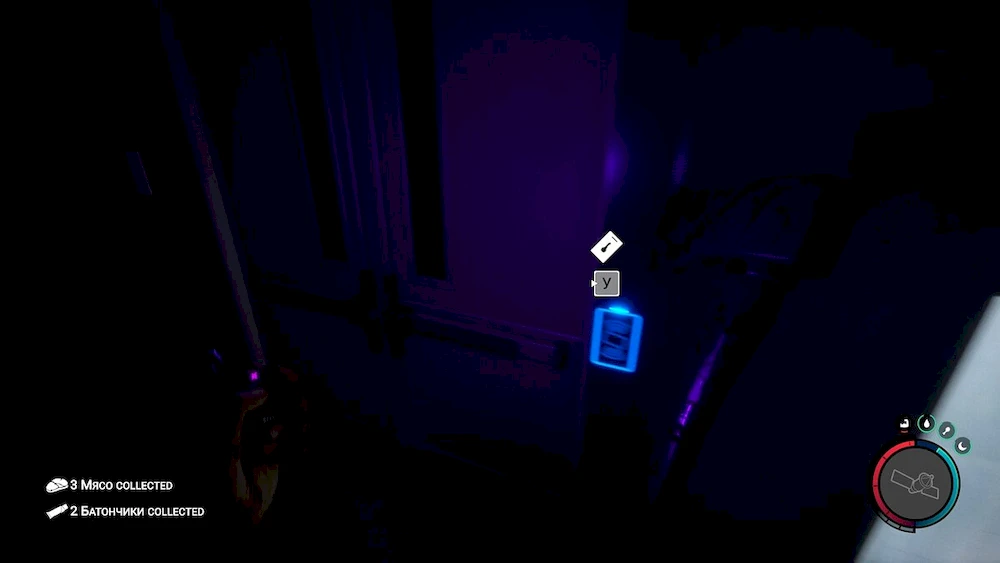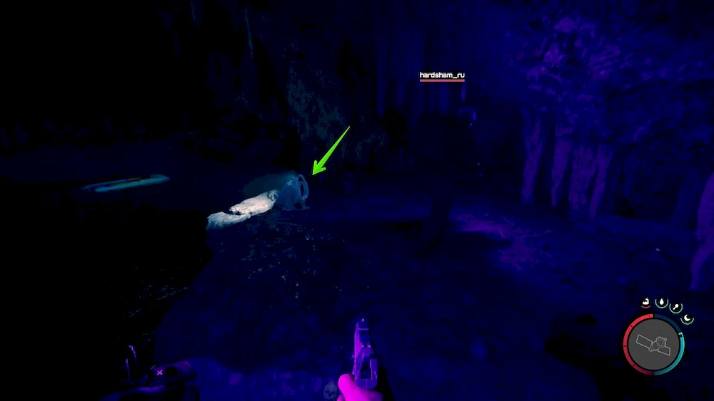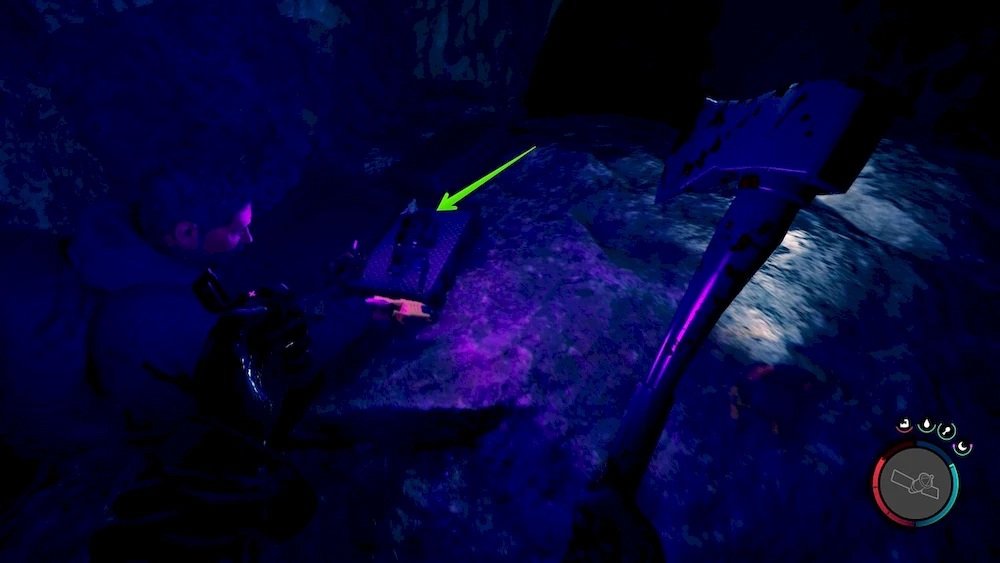 В этой же пещере есть стрелы для лука. Но у вас теперь есть 3D-принтер — вы сможете печатать их. Также вы найдете здесь закрытую дверь. Чтобы отпереть ее, нужна ключ-карта (мы разберемся с этими предметами чуть позже). Запомните точку на карте и отправляйтесь далее — к фиолетовой метке.