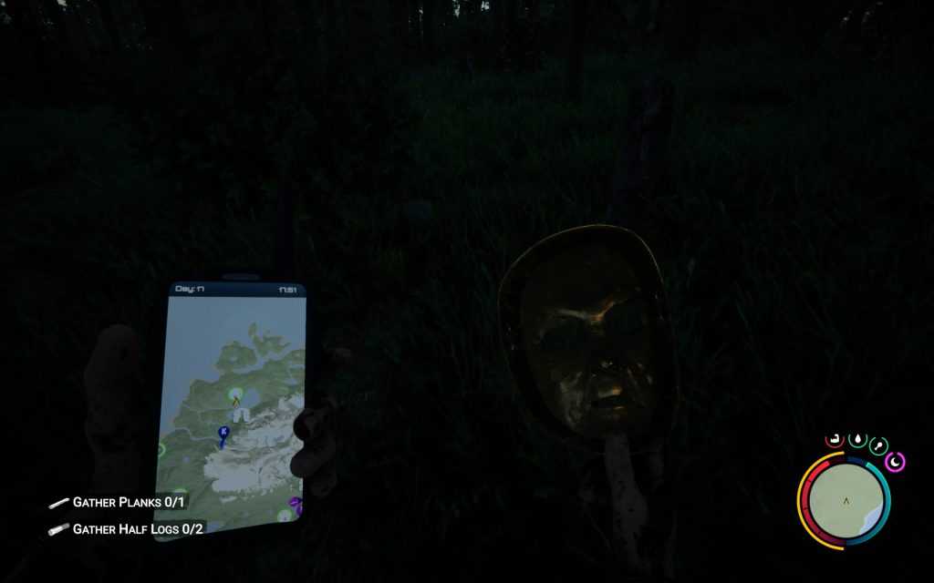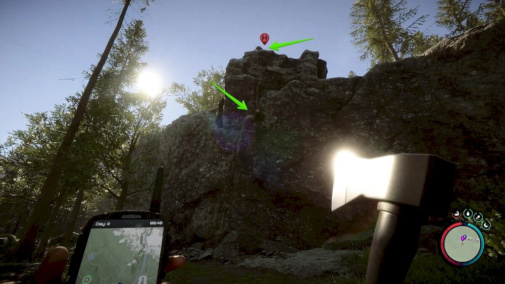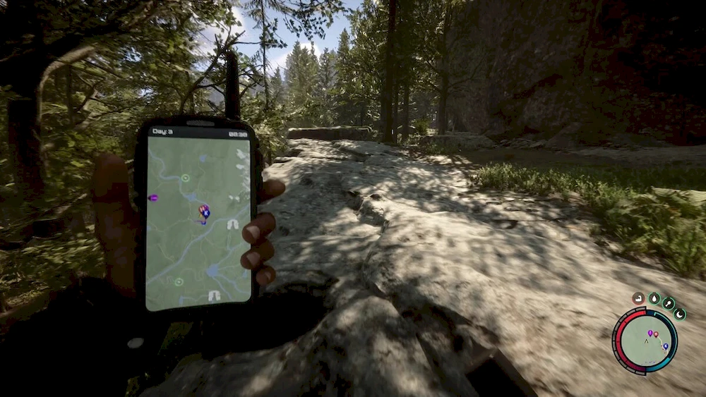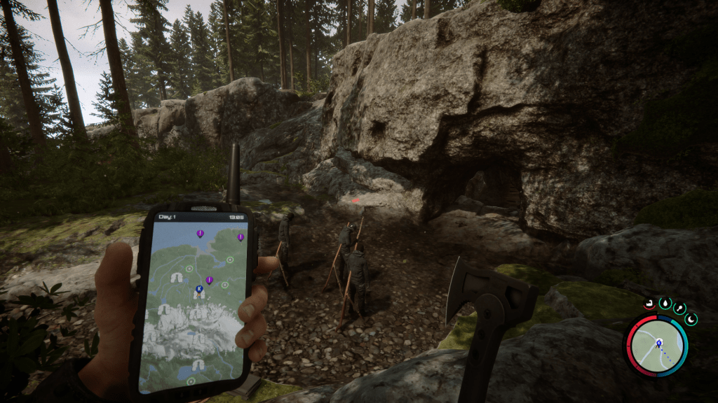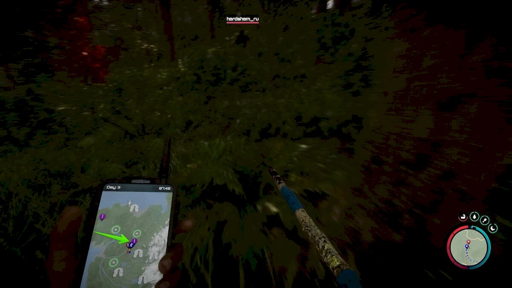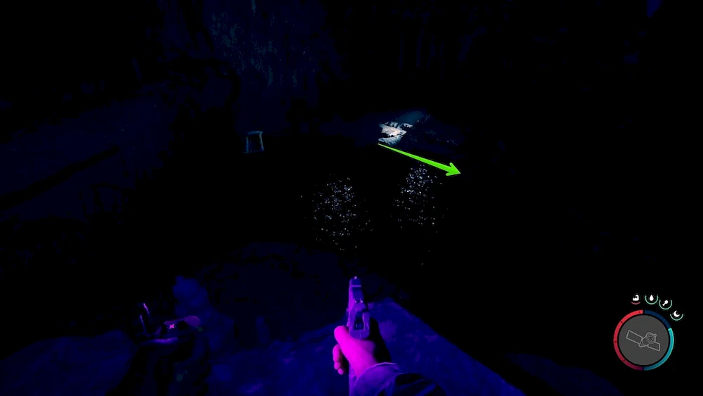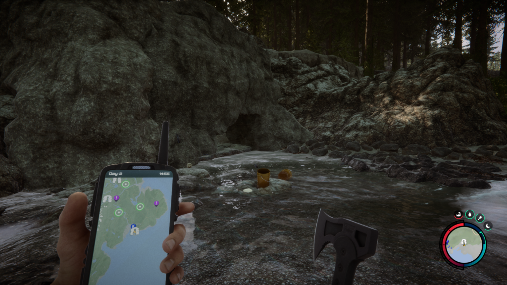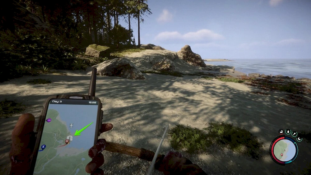 Итак, вы запустили Sons of the Forest и немного побродили по стартовой локации. Ваша первая задача в игре — найти 3 маячка. Они отображена на GPS в виде фиолетовых отметок. До двух из них добраться несложно, а вот, чтобы забрать третий, необходима лопата. Поэтому первым делом нужно отправиться на изучение подземелий, чтобы найти там эту лопату и попутно — тросомет. Только после того, как у вас будут эти предметы, есть смысл отправляться к третьему маячку.