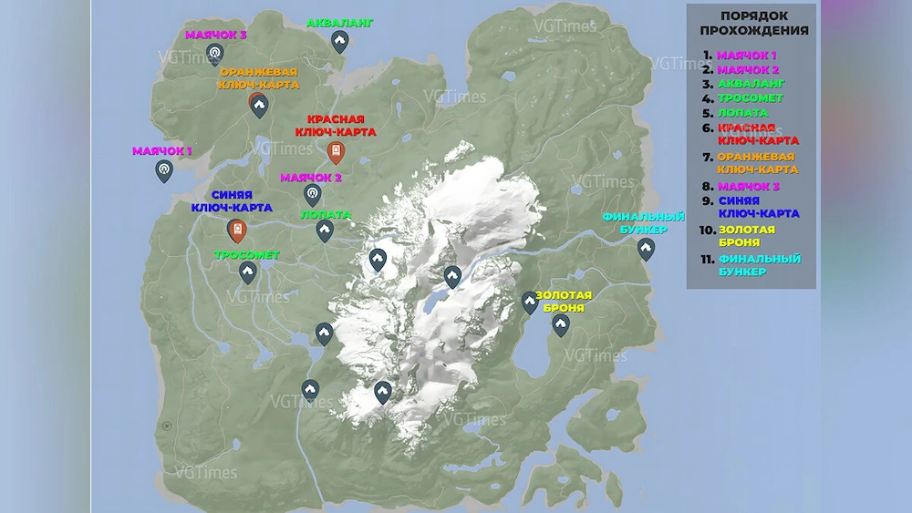 Rebreather: Находится в опасной пещере на пляже острова. Ищите маркер пещеры рядом с водой. На альтернативном пути вы найдете электрошокер. Идите дальше, чтобы найти бассейн с дыхательным аппаратом и дополнительным баллоном с воздухом. Вы можете использовать его, чтобы выйти через подводную пещеру в море.