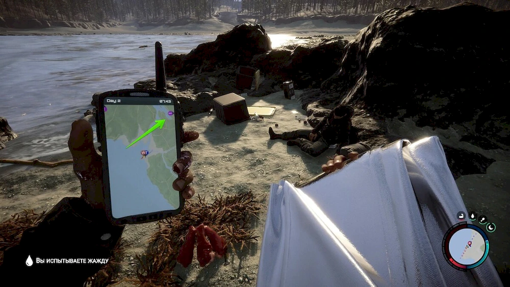 Второй маячок находится ближе к центральной части локации. Направляйтесь к нему, игнорируя третий маячок, который закопан в землю. По пути стоит заглянуть в точку интереса (отмечена на GPS зеленым цветом).