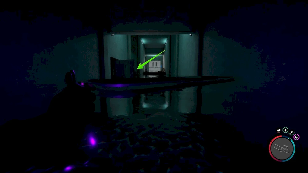 Все помещения впереди затоплены, но применять акваланг не нужно. Просто двигайтесь вперед до тех пор, пока перед вами не появится развилка. Слева находится помещение с монстрами. Идите туда, убейте противников и возьмите оранжевую ключ-карту (она находится на столе).