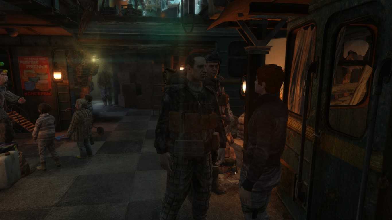 1. Когда на платформу прибывает дрезина с беженцами слушаем их разговор с охранниками.