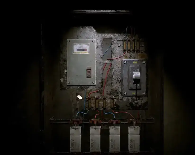 - Идите к электрощиту. Вставьте в него четыре предохранителя из инвентаря и поднимите рубильник.
