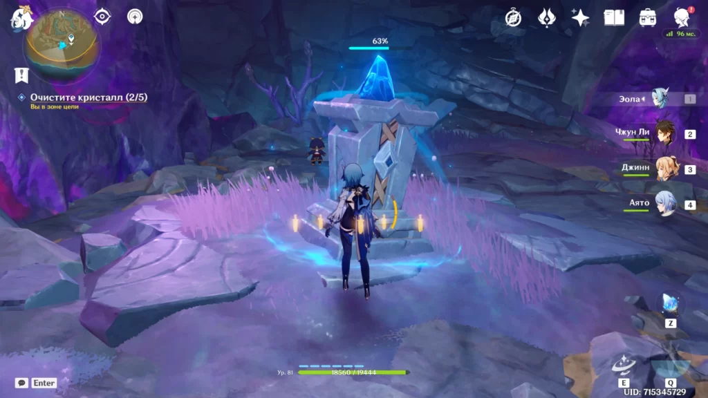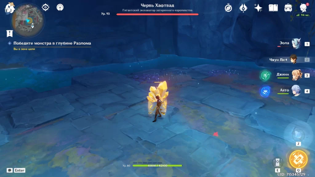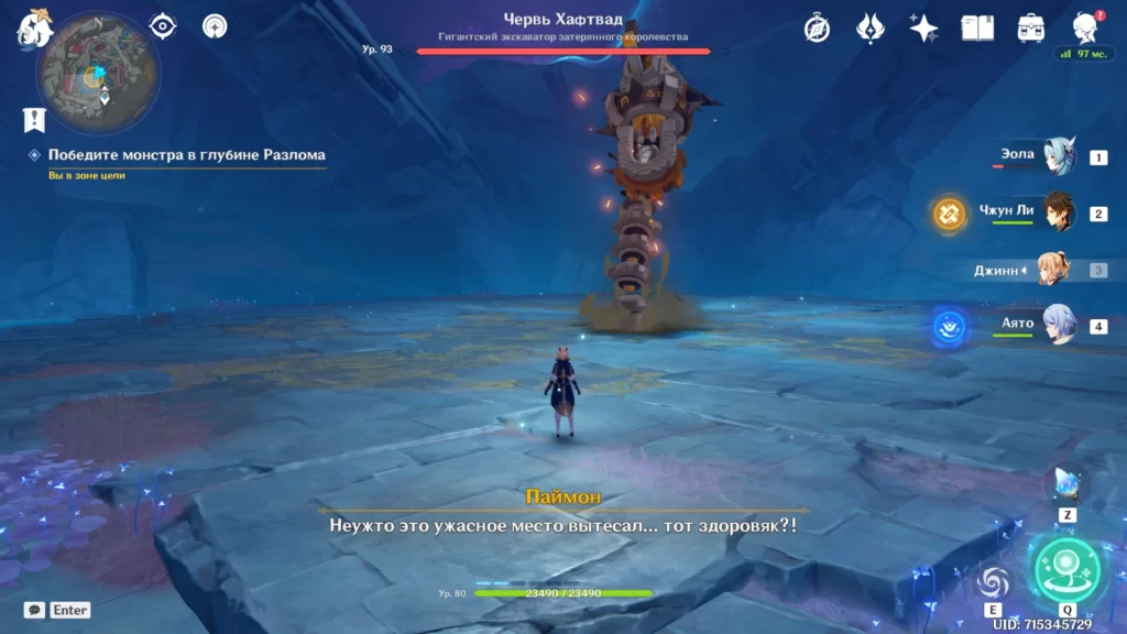 Между появлениями скважин нещадно лупим самого босса. Когда его здоровье достигнет отметки примерно 10-15%, урон по нему перестанет проходит, а Паймон закатит истерику. В этот момент нам поможет таинственная незнакомка и бой закончится.