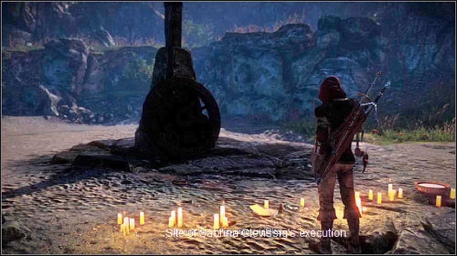 Возникает вопрос, когда вы проходите миссию «Ведьмак-2: Потерянные агнцы»: где место казни Сабрины? Ведь именно там нужно искать солдат, так где же оно находится? Если вы уже обнаружили Каэдвенский лагерь, то место гибели находится неподалеку. Вы узнаете это местечко по столбу и колесу. Очень часто, в особенности в темное время суток, последователи культа оставляют возле столба свечи в память о своей святой.