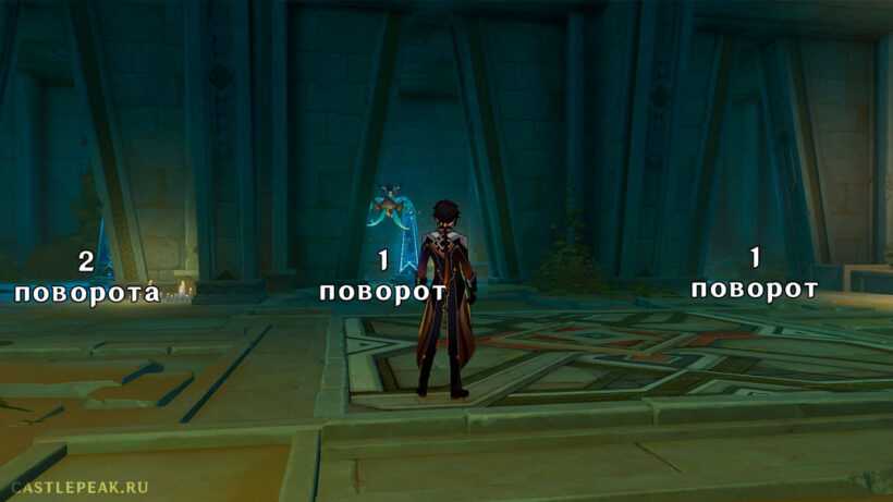 Чтобы пройти в глубь руин, нужно решить небольшую головоломку с монументами. Рядом с ними будет подсказка «Руководство по подношениям»: «Посмотри на зал как смертный и послушай священное наставление царя Дешрета.»