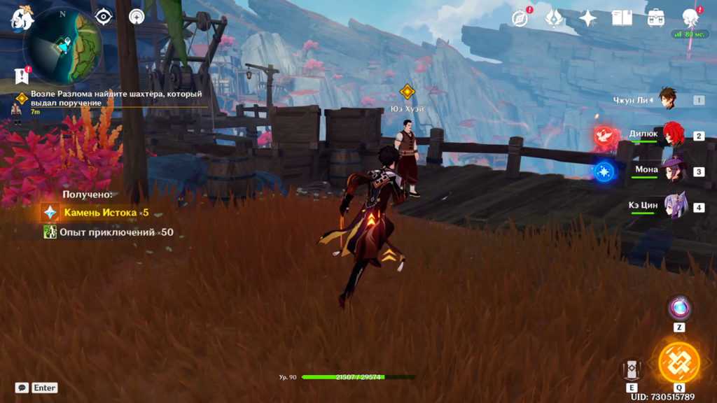 Шахтёра зовут Юэ Хуэй, он стоит недалеко от основного лагеря рядом со входом в область Разлома. Пропустить его сложно, на скриншоте ниже указано местонахождение.