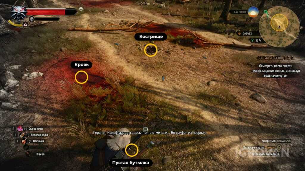 В итоге охотник приведёт ведьмака на то место, где грифон напал на нильфгаардских солдат. Вам нужно найти следующие улики: