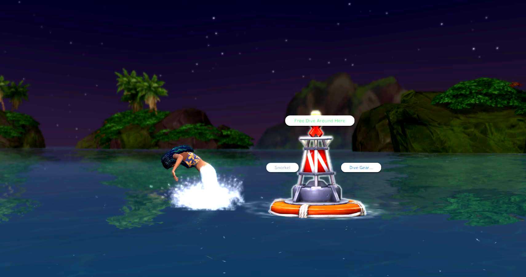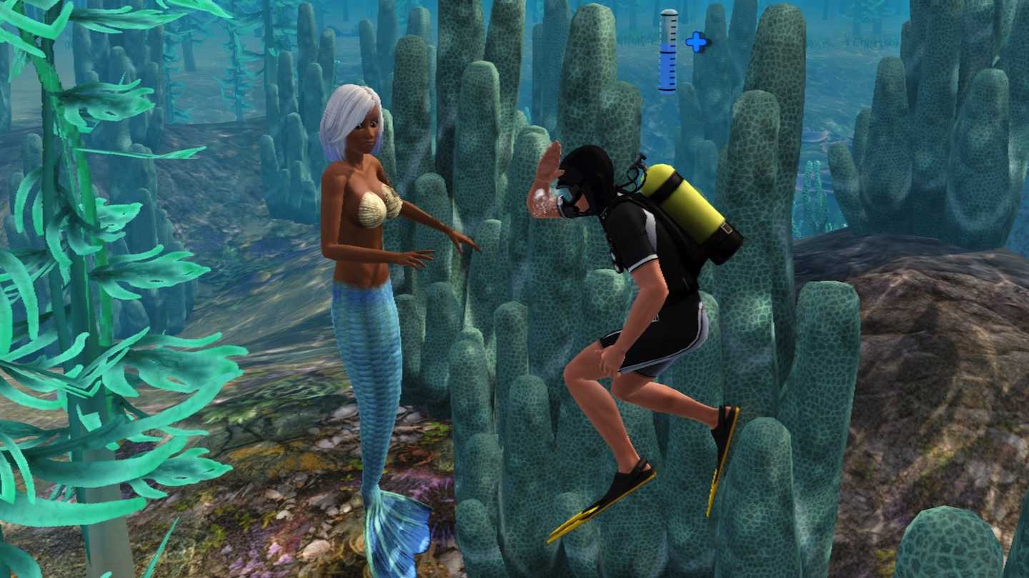 Если вы нажмете на буйки в океане, появится несколько различных вариантов, в зависимости от глубины воды, в которой находится ваш сим. Среди них — подводное плавание, покупка оборудования для подводного плавания, подводное плавание с аквалангом и свободное плавание. Русалка не может использовать или покупать оборудование для подводного плавания. Они также не будут нырять с маской или аквалангом, видимо, это запретная тема. Однако они могут получить доступ к опции свободного погружения и оставаться под водой гораздо дольше, чем обычные симы. Они также могут приобрести нож для подводного плавания, инструмент для поиска сокровищ и подводную камеру, которые позволяют им свободно нырять за ракушками, сокровищами и делать подводные фотографии соответственно.
