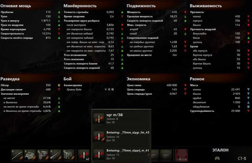 Если сравнивать с другими танками 5 уровня, то можно увидеть, что орудие 75 mm Kan m 43 strv имеет огромный разовый урон в 150 единиц на 5 уровне танков. Разброс на 100 м составляет 0,39 весьма хороший показатель для своего уровня, но вот время сведения в 2,4 секунды хуже среднего показателя на уровне WoT. Максимальная скорость подкачала, составляет всего 45 км\ч, весьма медленно для среднего танка.