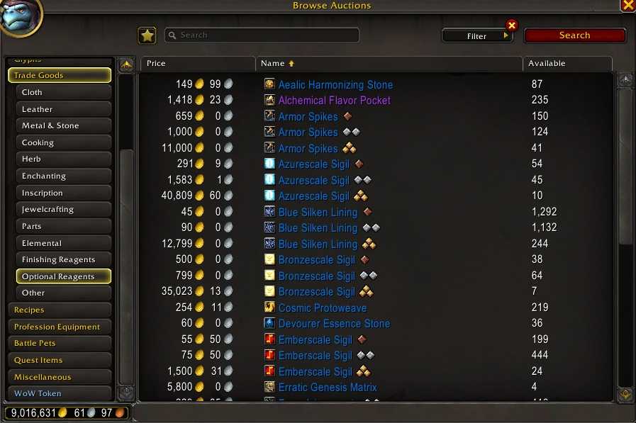 К счастью, эти предметы можно купить на аукционе. Если вы тот, кто хочет просмотреть все ваши варианты, вы можете отсортировать их по «Товары для торговли» — «Дополнительные реагенты» в меню аукциона по умолчанию. Вы увидите смесь реагентов для украшений и других реагентов, так что вам придется отсортировать их, чтобы найти то, что вы ищете. Чтобы сделать этот процесс еще проще, если вы отфильтруете только редкие и эпические предметы, вам придется меньше просматривать.