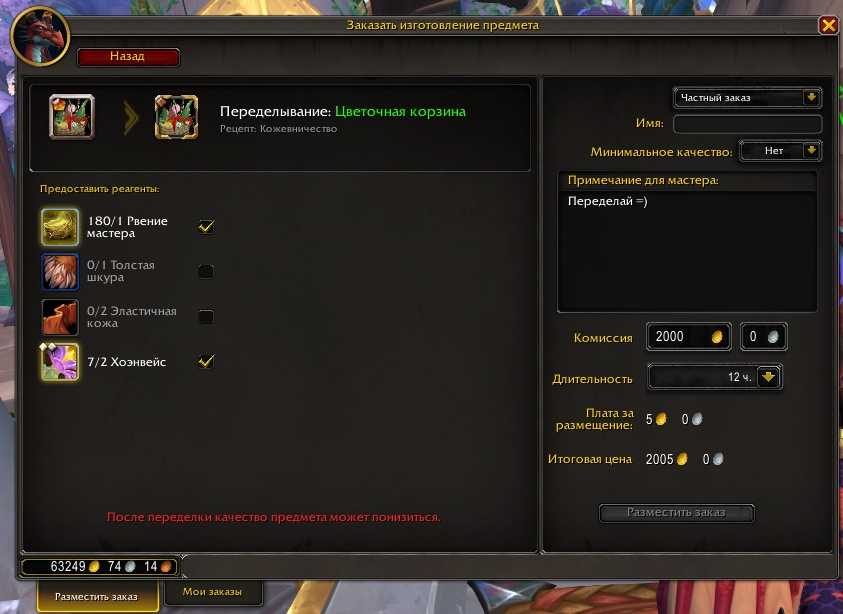 Обратите внимание, что при создании публичного заказа нельзя выбрать качество готового предмета. Это означает, что вашу заявку может взять ремесленник с недостаточным уровнем квалификации, из-за чего вы с большим шансом получите вещь низкого ранга качества