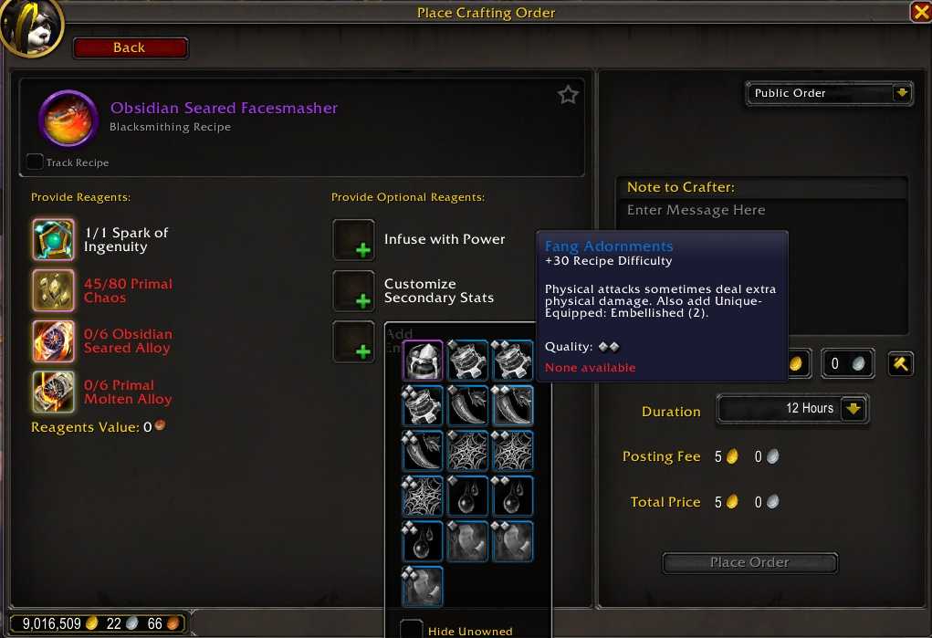 Если вы размещаете публичный заказ на создание этого предмета, вам необходимо будет предоставить дополнительный реагент и все материалы для предмета. Если вы не хотите предоставлять предметы (помните, что если вы создаете предмет эпического качества, вам всегда нужно предоставлять Искру изобретательности и Первобытный хаос ), вам придется найти мастера и разместить личный заказ непосредственно у него. Независимо от того, какой тип заказа вы размещаете, вам нужно будет предоставить дополнительный реагент для украшения.