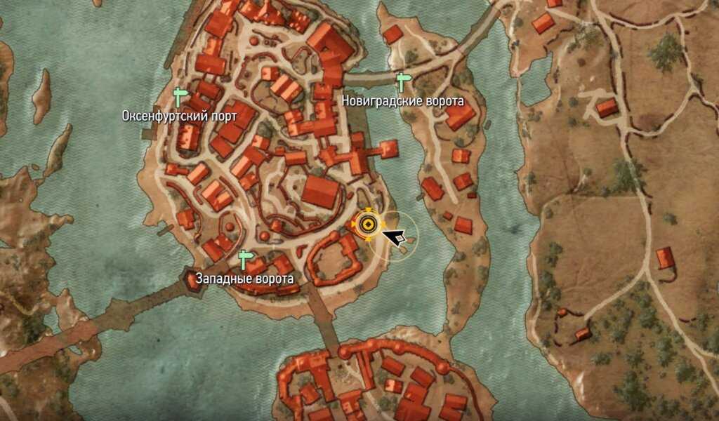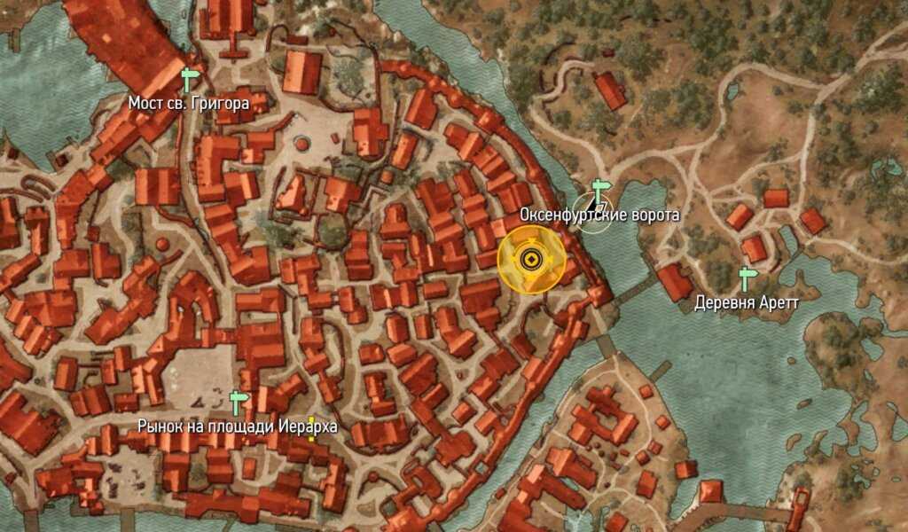 На восточной окраине города Оксенфурт мы находим здание, отмеченное на карте. Заходим и спускаемся в подвал. Доходим до комнаты с решетчатыми дверями и в дальнем правом углу находим торчащий кирпич. Вытащив его, открываем потайную дверь в стене: прямо за ним сундук с улучшенным дизайном брюк для Школы кошек.