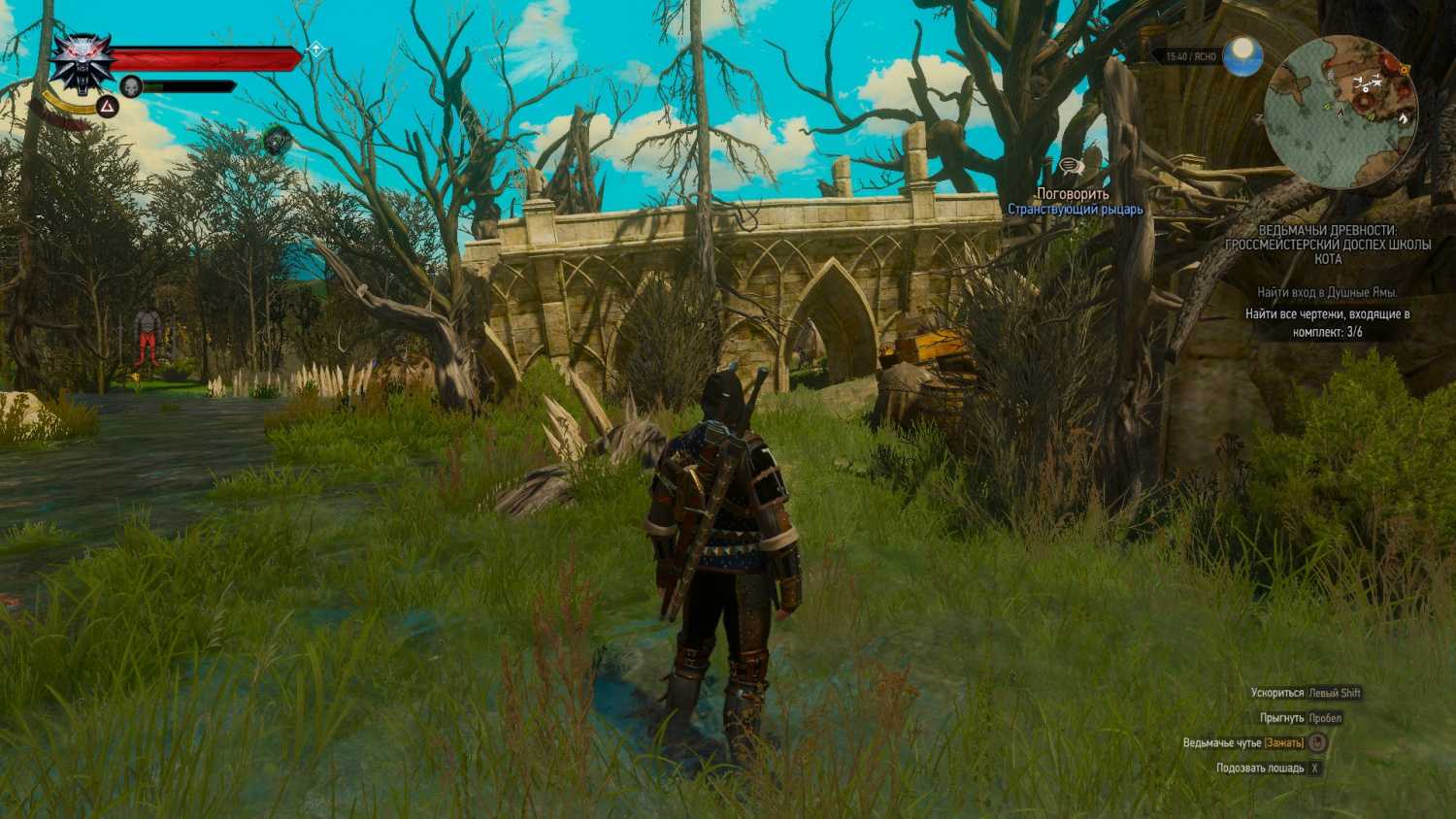 К юго-востоку от деревни Стежки находим большой алтарь с разрушенной лестницей. По обеим сторонам от входа расположены круглые колодцы. Нужный нам сундук с чертежом мастерского доспеха Школы Волка лежит в левом.