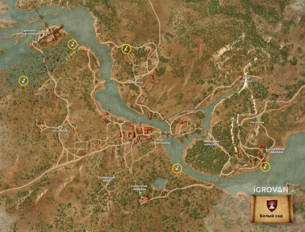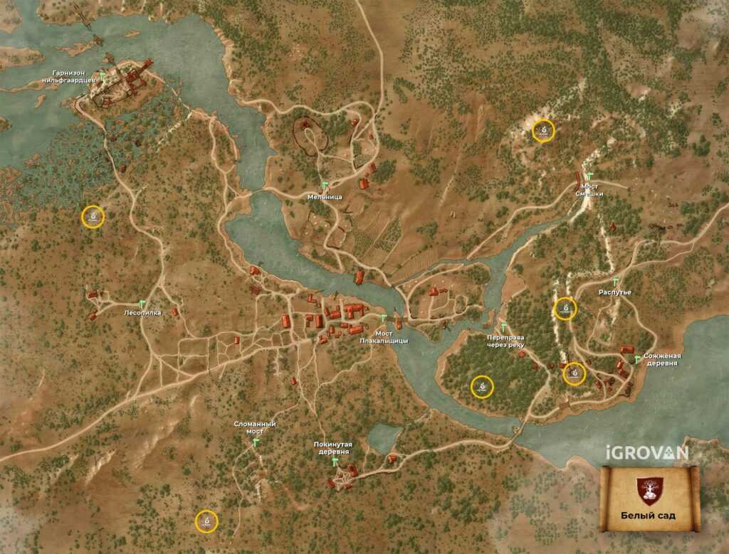 В Белом саду есть три спрятанных сокровища. Все они активируют три дополнительных квеста: «Темерские ценности» (в рамках этого квеста можно найти ключ от сундука на мельнице), «Золото дезертиров» и «Грязные деньги».