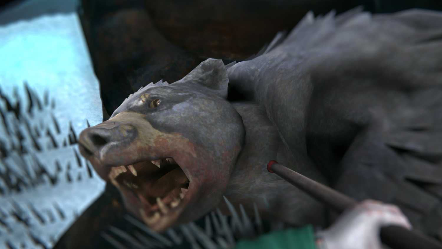 Забираем копье и сражаемся с медведем – нужно одержать три победы. Закалываем мишку и покидаем пещеру.