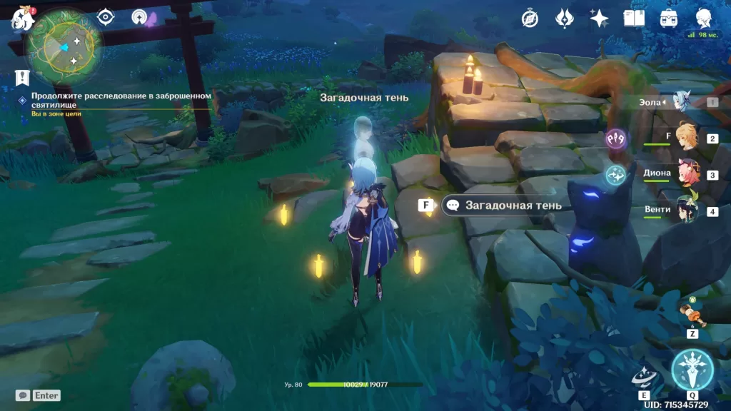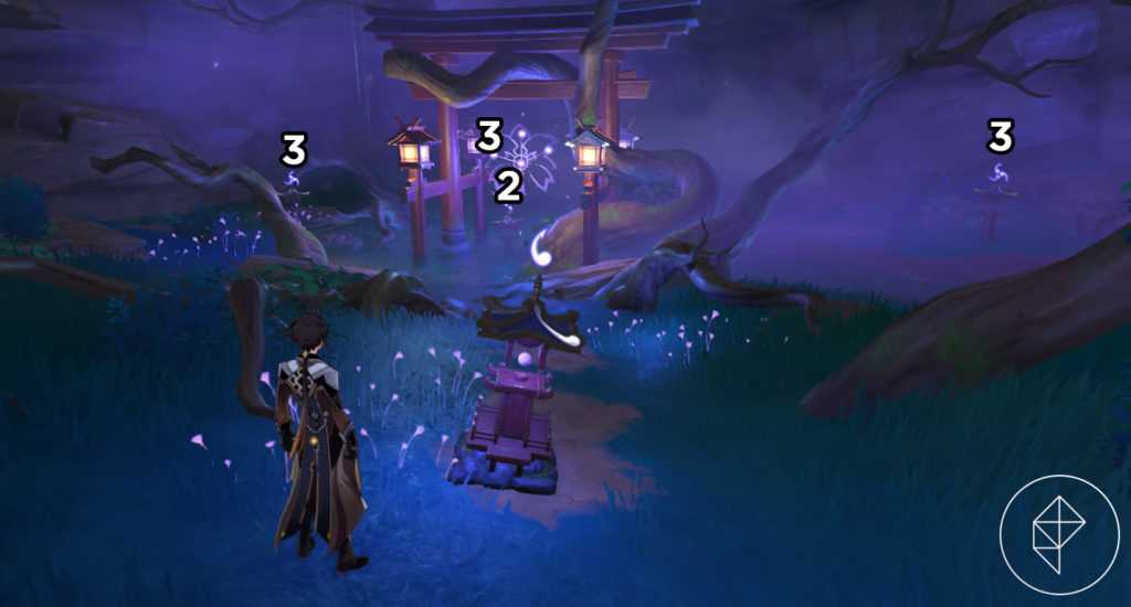 Прочитав подсказки, приступаем к решению загадки с загадочными духами. Наша задача — переместить три блуждающие тени к трем статуям лисицы в центре области. На скриншоте обозначены места, где можно найти тени.