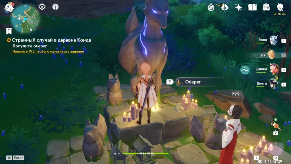 По словам жрицы на статуе есть оберег, снять который может только тот, кто храбр, ценит дружбу и к кому благосклоннее Электро элемент. Мы как раз подходим для этого. После получения оберега, жрица представится и даст немного больше информации.