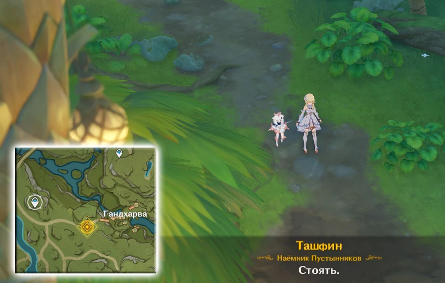 Идем дальше вплоть до дома Тигнари (не забываем нажимать «отслеживание»). Снаружи стоит Коллеи и она расскажет, что ее наставник спешно умотал в Пардис Дхяй.
