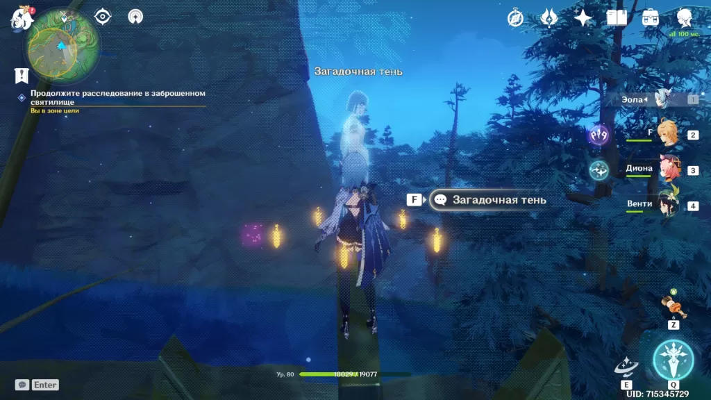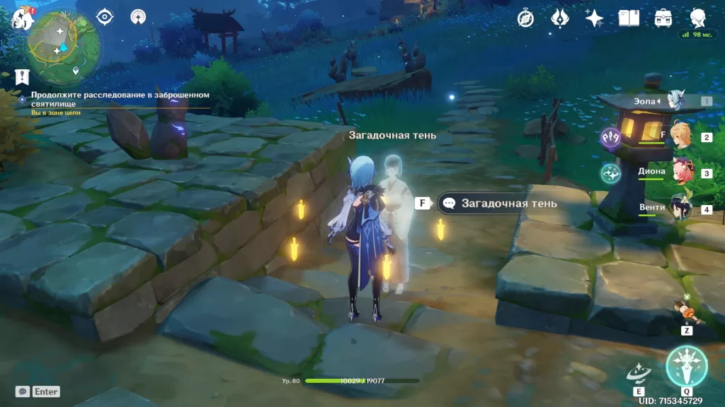 Первая загадочная тень находится рядом со статуей, где мы читали подсказки. Говорим с ней, и она сразу переместится в нужное место.