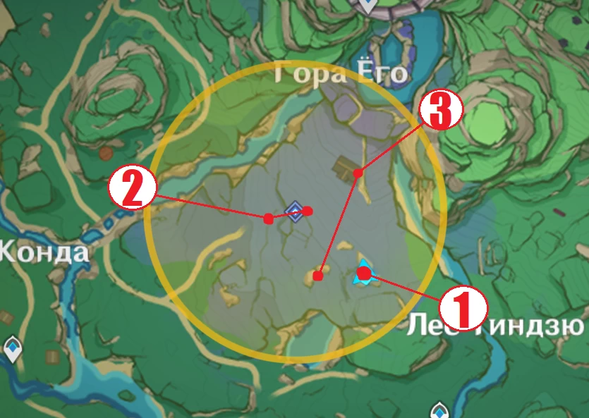 - Отправляетесь в заброшенное святилище к северо-востоку от деревни Конда.На входе в жёлтую область на карте, вы увидите деревянную арку, а за ней Загадочную тень (очертания призрака).