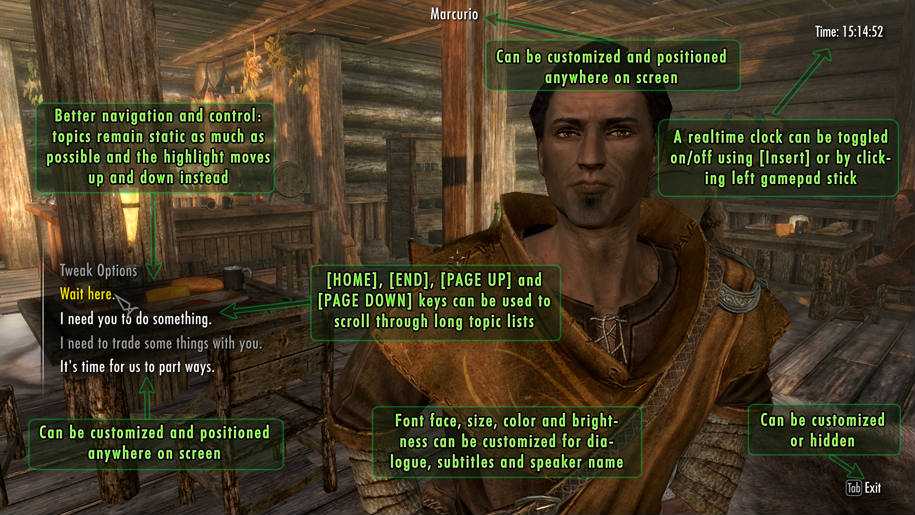 Этот мод заменяет меню диалога в игре Skyrim SE. Это позволяет полностью настроить внешний вид и расположение диалогового меню, реализует намного лучшую навигацию и систему управления, а также исправляет ряд ошибок, которые присутствуют в обычном игровом меню диалогов. Попрощайтесь с трудно читаемым светло-серым цветом и темно-серым текстом в диалогах и раздражающим управлением на основе клавиатуры и мышки.