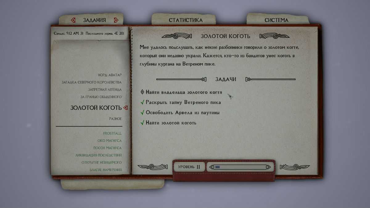 Квест, НЕ отображается в журнале заданий, но всплывает надпись о том что нужно сделать. Данный квест можно начать зайдя в “Инеевый Маяк”. Он находится практически ровно по середине между Данстаром и Винтерхолдом, или чуть чуть юго-западнее Пещеры Хоба. В данном квесте нам предстоит разузнать причину смерти владельцев маяка. По всему маяку раскиданы дневники обывателей из которых можно вычитать очень трогательную историю.