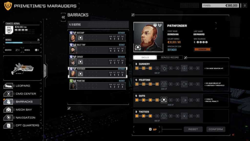 У каждого меха есть свой «мехводитель». Пилотов можно нанимать на рынке наёмников и все они имеют 4 ветки умений: стрельба, пилотирование, выдержка и тактика. Стрельба отвечает за точность стрельбы, пилотирование за успех рукопашной атаки и увороты, выдержка за выживаемость пилота и тактика — за удары непрямой наводкой. В каждой ветке есть специальные умения вроде возможности стрельбы по нескольким целям и прицельного выстрела, но по факту не все из них реально полезны в игре.