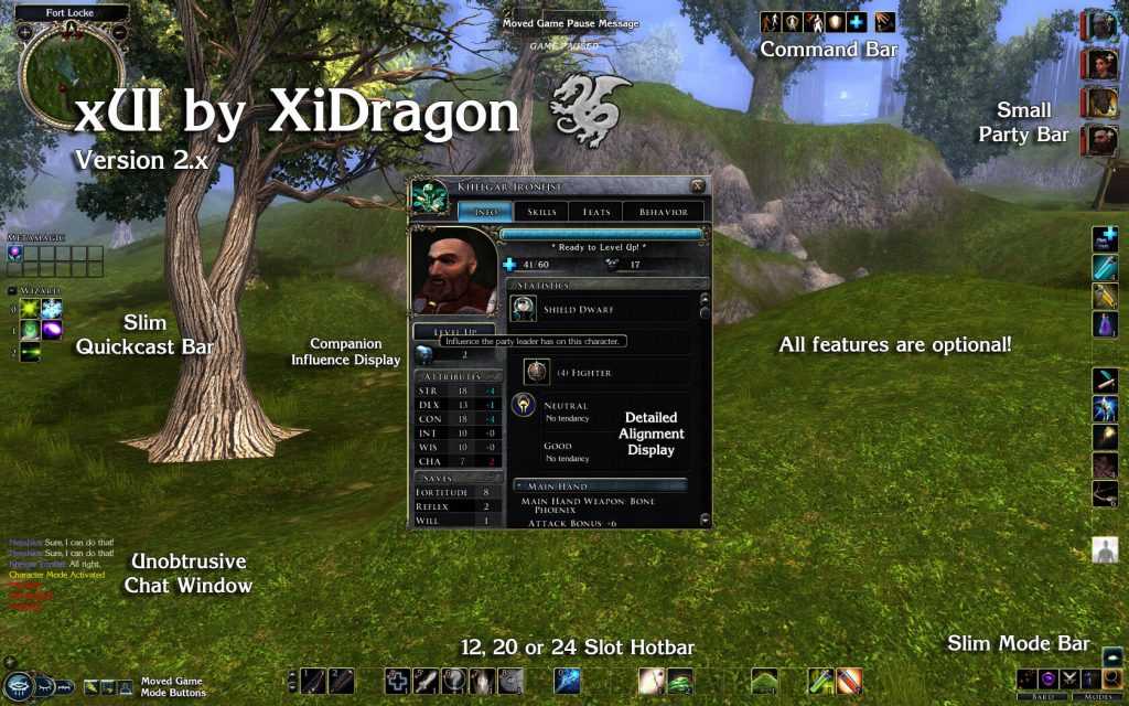 Графический интерфейс для NWN версии 1.23/Дополнения «Маска Предателя» и «Шторм Захира», в который входит: командная панель, горячие клавиши (12, 20 или 24 клавиши), правильное расположение окна создания персонажа и окна влияния на персонажей, уменьшенная панель модификаций, уменьшенная панель сопартийцев, исчезающее окно чата, дополнение для лучшей видимости текста и т.д. С помощью установщика и конфигуратора вы сможете добавлять и удалять нужные дополнения для xUI даже после их установки.