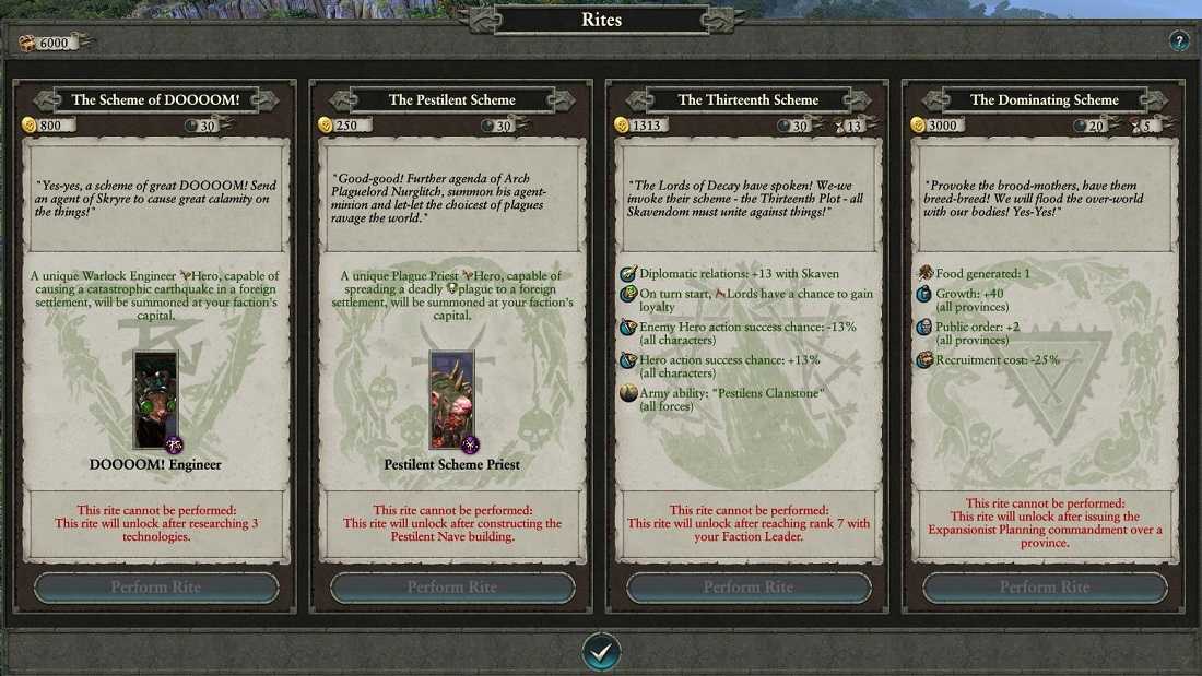 Обряды скавенов уникальны по двум причинам – во-первых, они отличаются у каждого клана, а во-вторых, два первых обряда предоставляют героев-камикадзе, каждый из которых может быть использован только по 1 разу. Инженер РООООООКА! разрушит землетрясением стены любого вражеского города, чтобы вам не пришлось выстаивать осаду (которые крысы, к слову, не любят), а уникальный Чумной жрец заразит чумой поселение врага, нанося урон как по здоровью гарнизона, так и по экономике врага.
