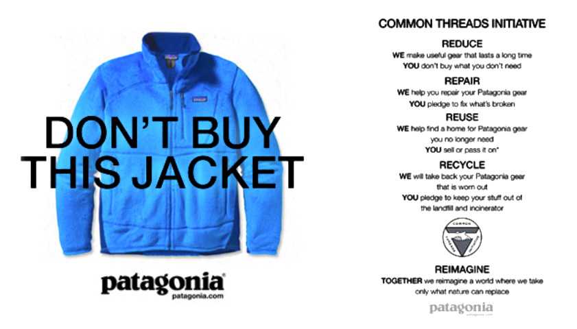 Рекламный плакат бренда Patagonia. Слоган «Не покупай эту куртку». Подпись гласит примерно следующее «Общественно-значимые инициативы. Вместе мы сможем уменьшить наше влияние на окружающую среду»