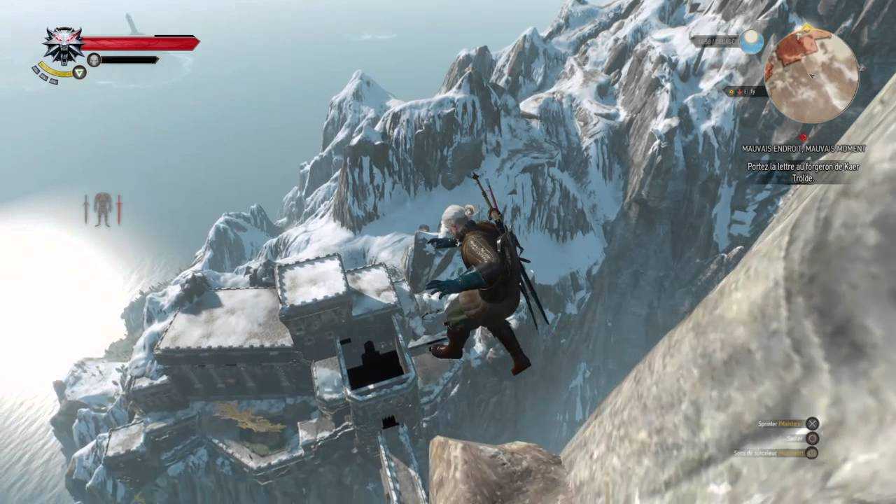 Геральт из Ривии может быть сколь угодно легендарным ведьмаком, победившим опасных чудищ и повлиявшим на судьбы королевств, но умереть из-за падения с небольшого пригорочка – для него в порядке вещей. Разумеется, опытные игроки знают, что при падении надо нажать еще раз на клавишу прыжка, чтобы при прикасании с землей Геральт сделал кувырок и снизил урон от падения. Но далеко не всегда спасает этот прием и легко замешкаться на секунду, не успев нажать на спасительную кнопку.