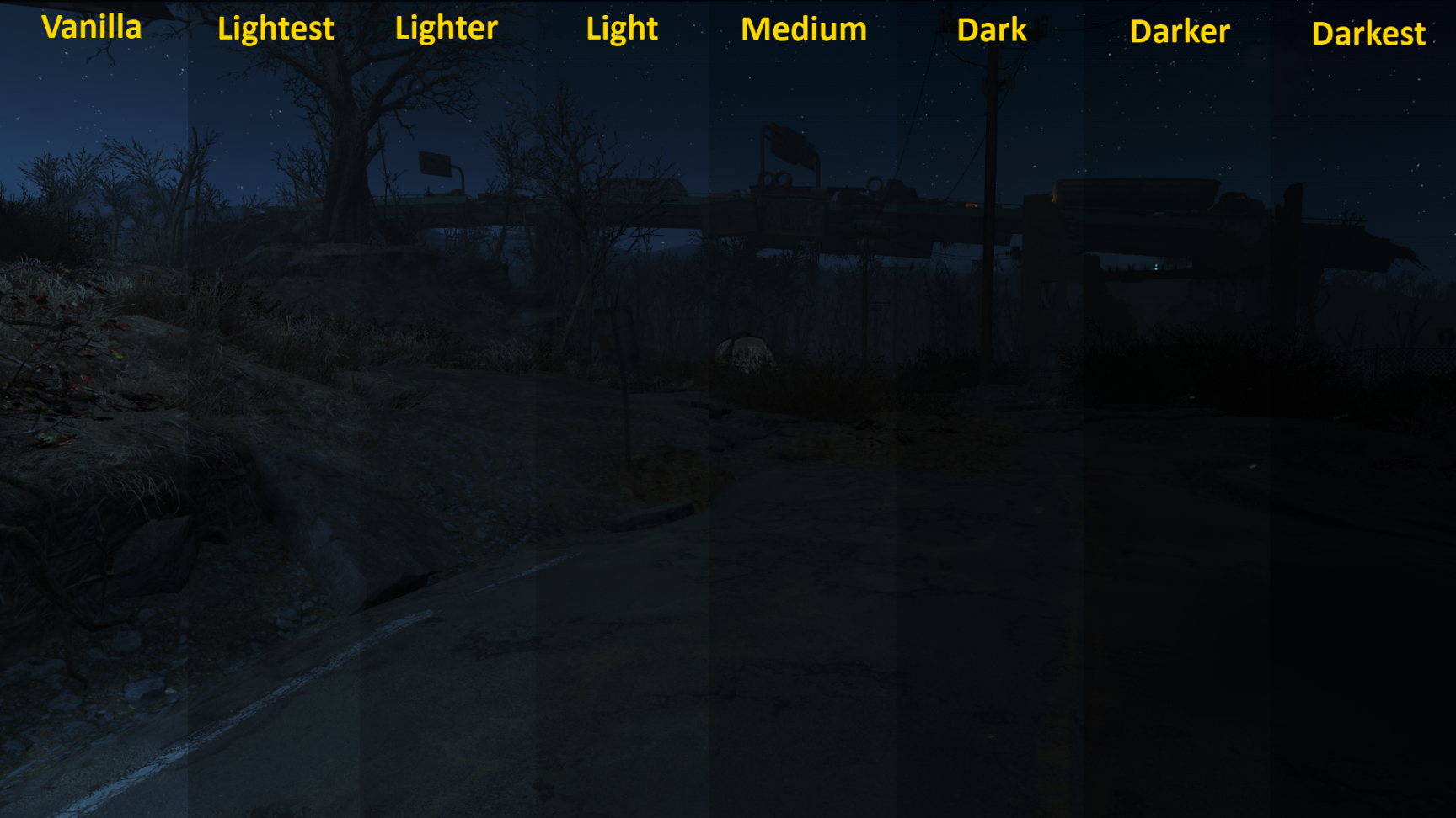 Базовый мод для всех, кто хочет сделать ночные вылазки по миру игры намного более атмосферным и пугающим приключением. Гениальное просто – модификация значительно ухудшает видимость в ночное время суток, что ожидаемо приводит не только к повышенному реализму, но и пугающим ситуациям, когда не зги не видно, а из тьмы выныривают силуэты кричащих и стремительно приближающихся гулей. Просто 10 использованных подгузников из 10, поэтому крайне рекомендуем скачать этот мод на Fallout 4.