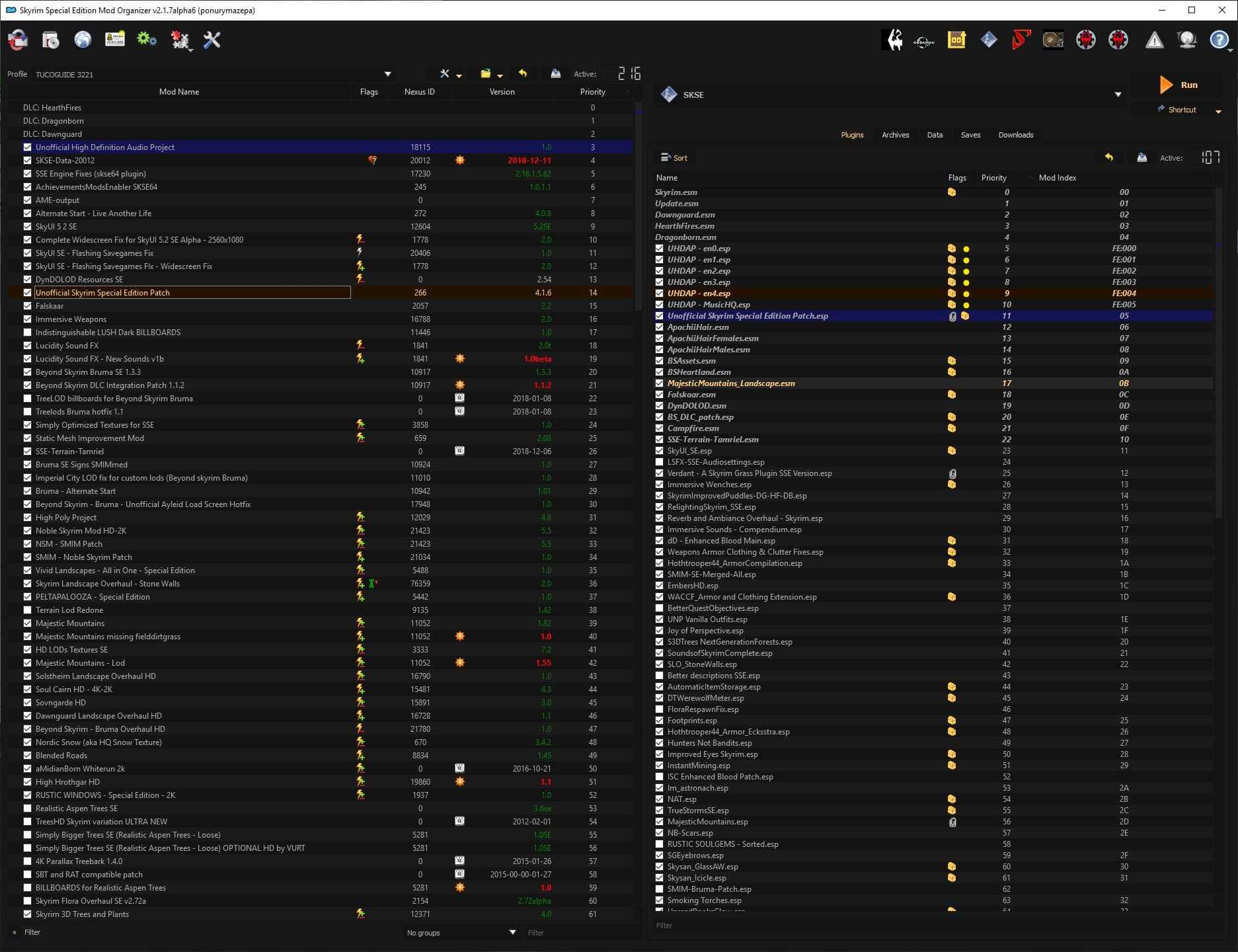 - Удобно видеть модификации, и при желании вносить свои правки. В моём проекте например все моды разложены по категориям, сортированы и аккуратно проставлены версии, которые быстро проверяются на обновления синхронясь с нексусом. Это очень сильно экономит время на проверку скажем 400-от модов. Раньше я на это тратил часы…