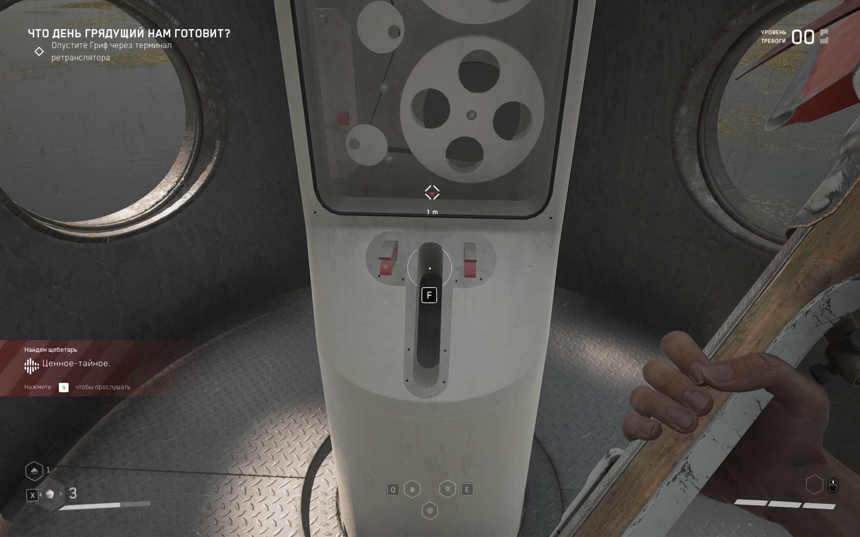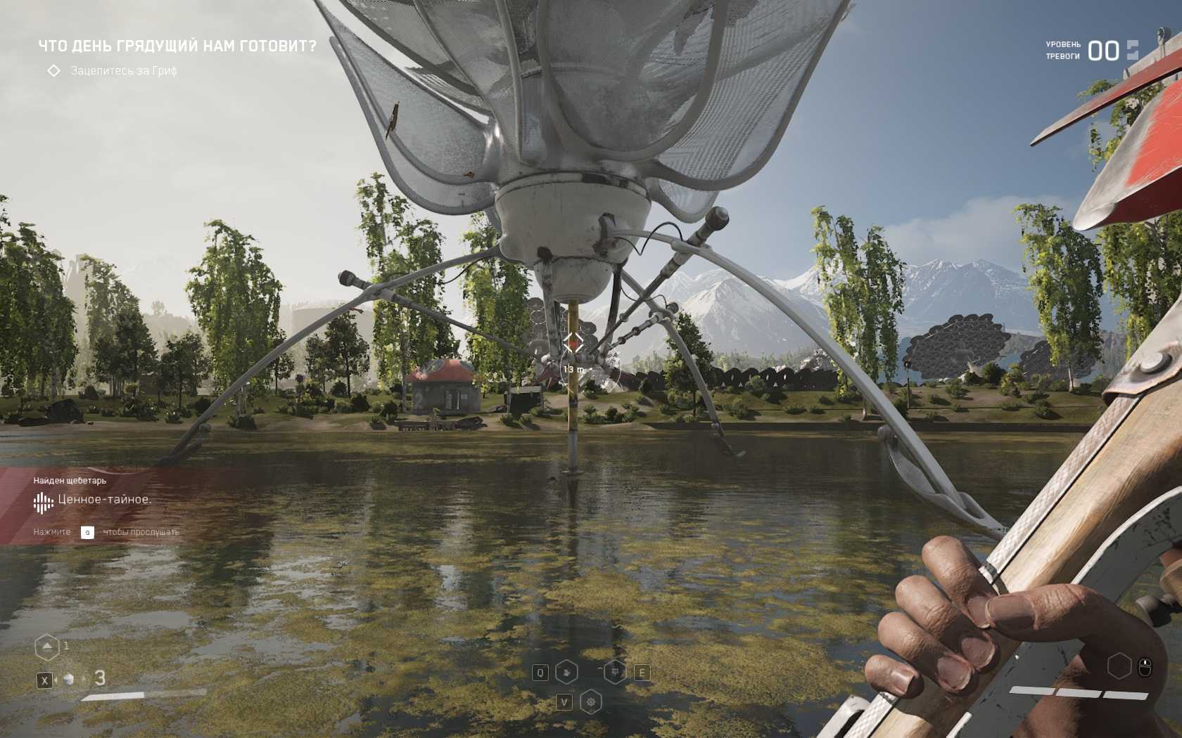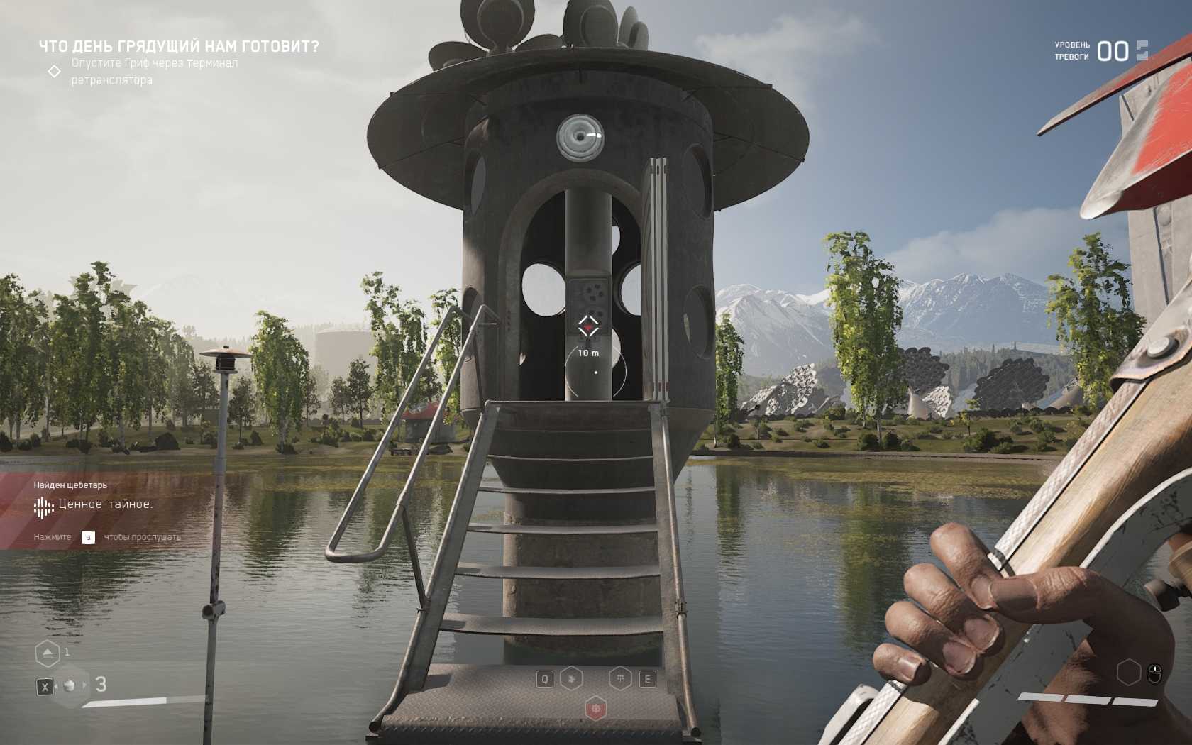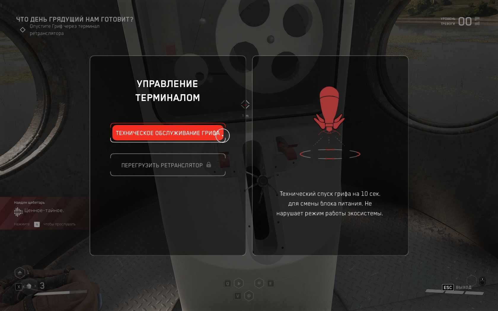 Вернитесь к ретранслятору, войдите внутрь и взаимодействуйте с ним. «Гриф» опустится в центр водоема.