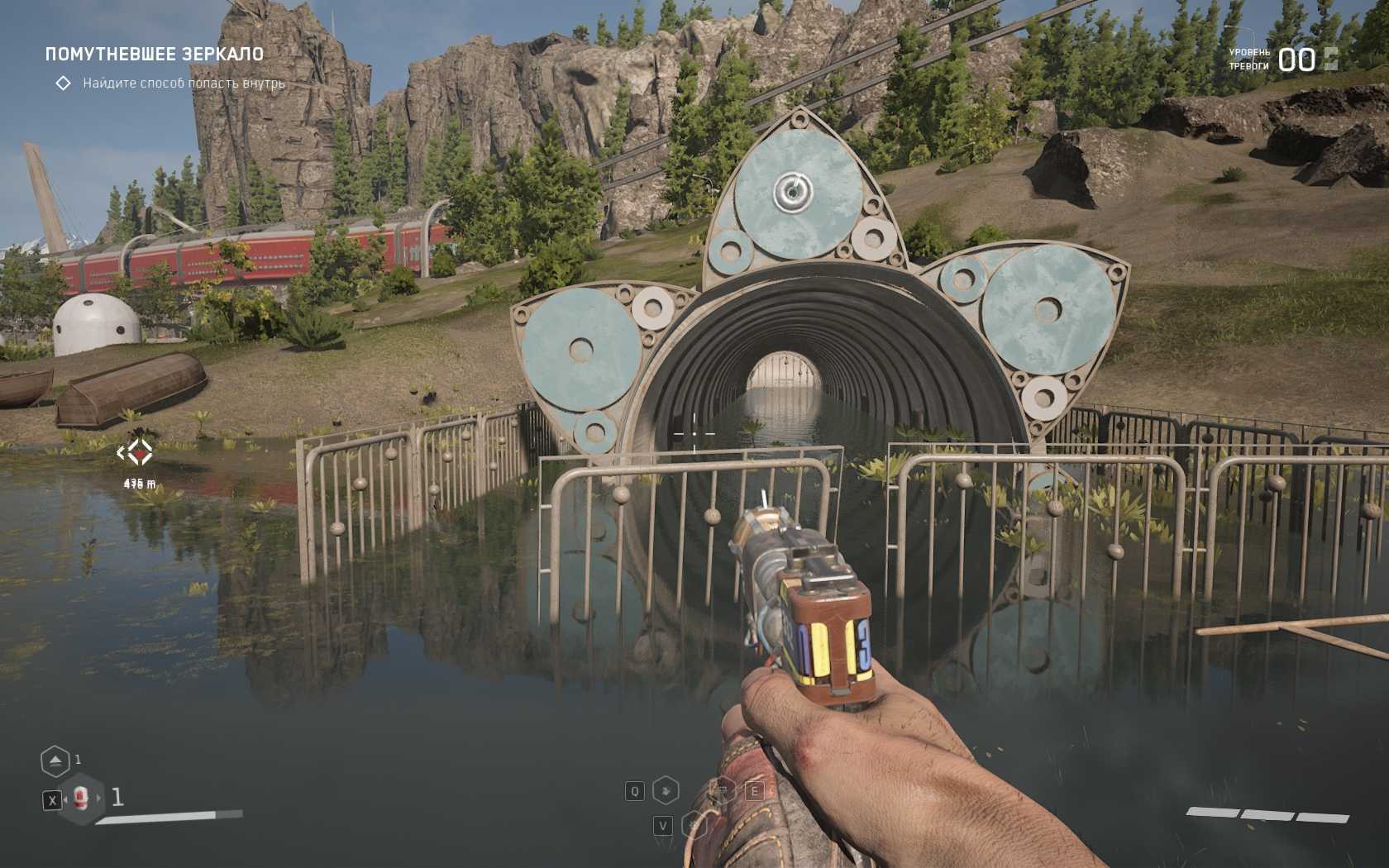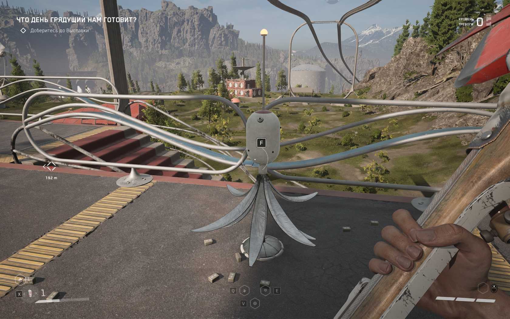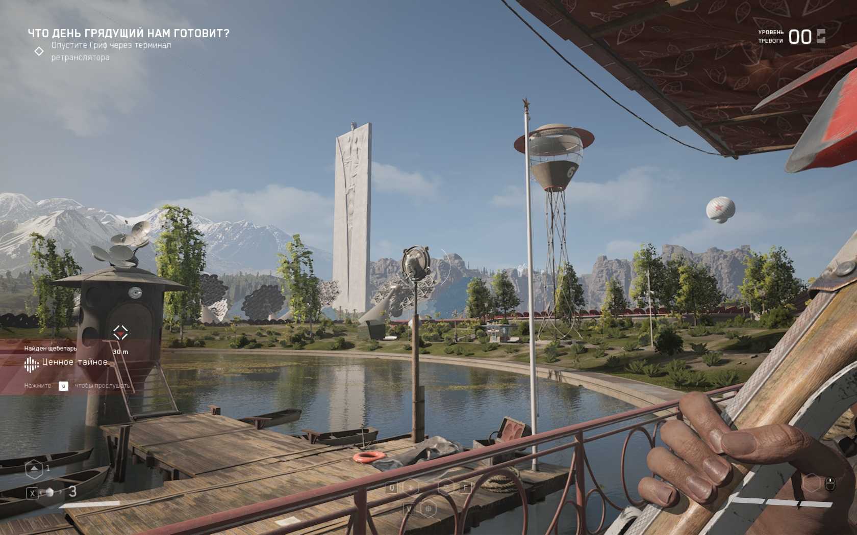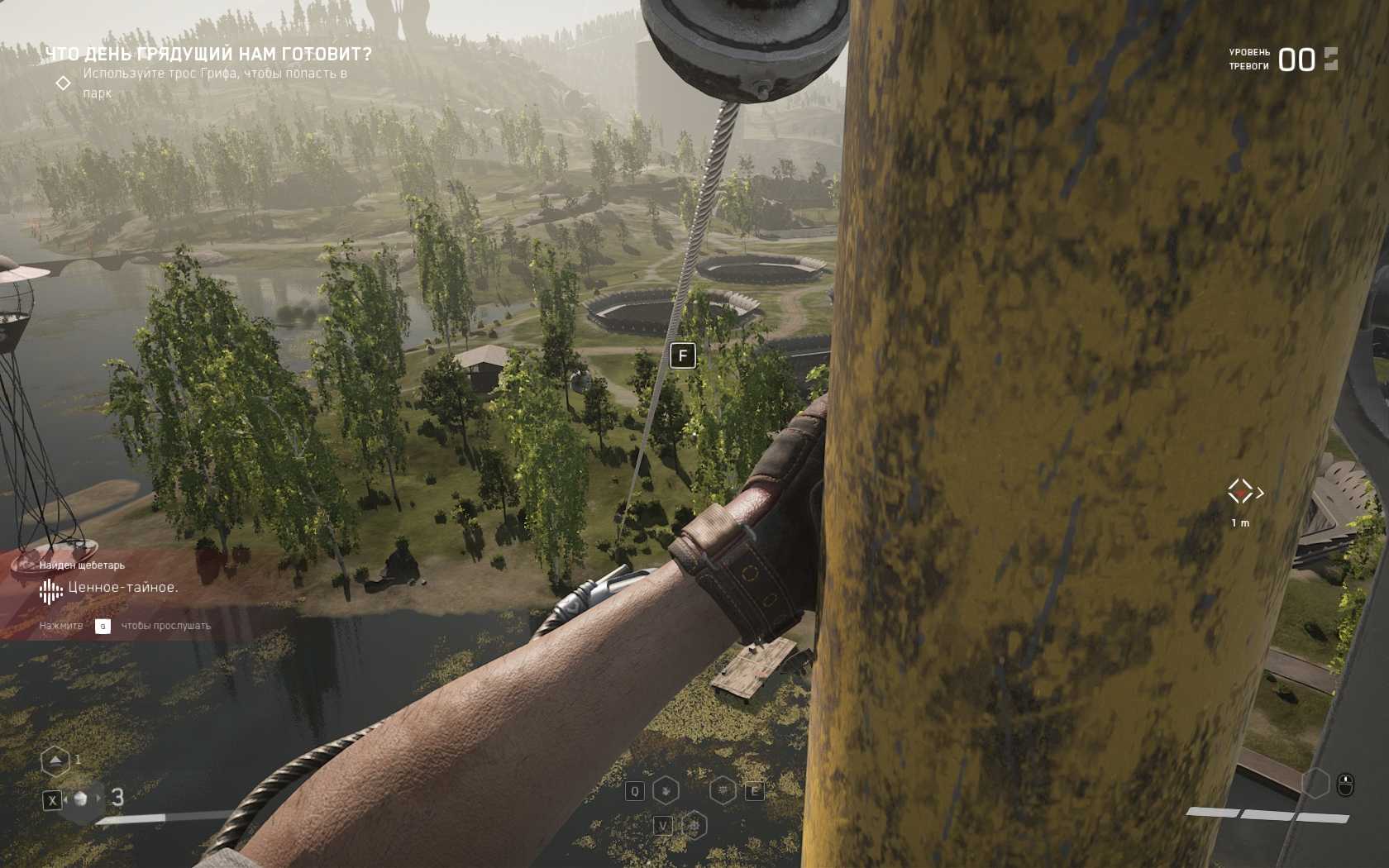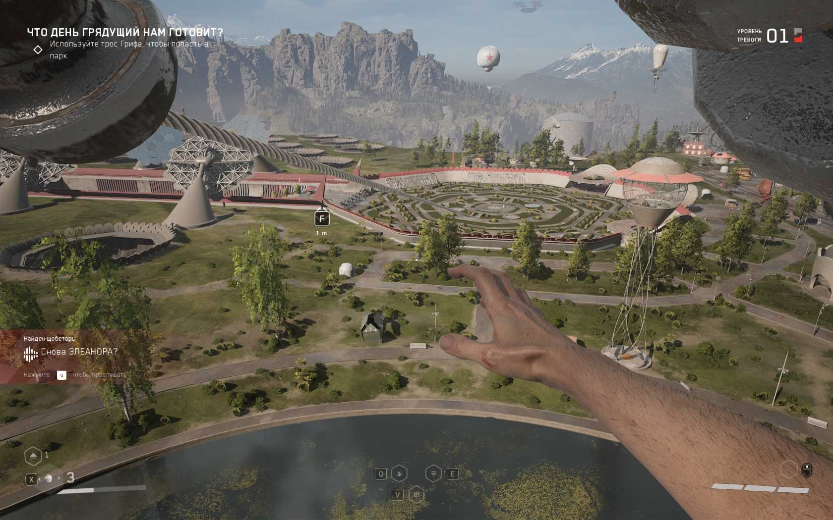 Идите к нему и зацепитесь за желтую трубу в центре конструкции. Когда «Гриф» взлетит, покрутите камерой и найдите вокруг себя три троса. Тот, который сзади, поможет вернуться на лодочную станцию. Трос перед главным героем доставит его на берег озера впереди, а трос справа – в парк (на арену). Вам нужно направо, но вы можете выбрать любую сторону, если хотите продолжить исследование территории. Еще раз опустить «Гриф» можно путем повторного взлома ретранслятора.