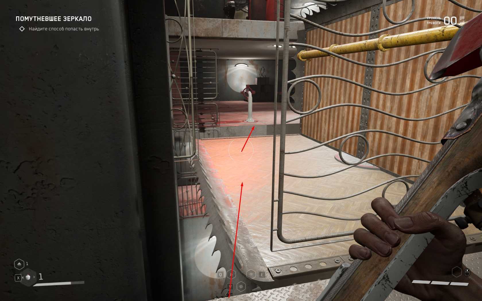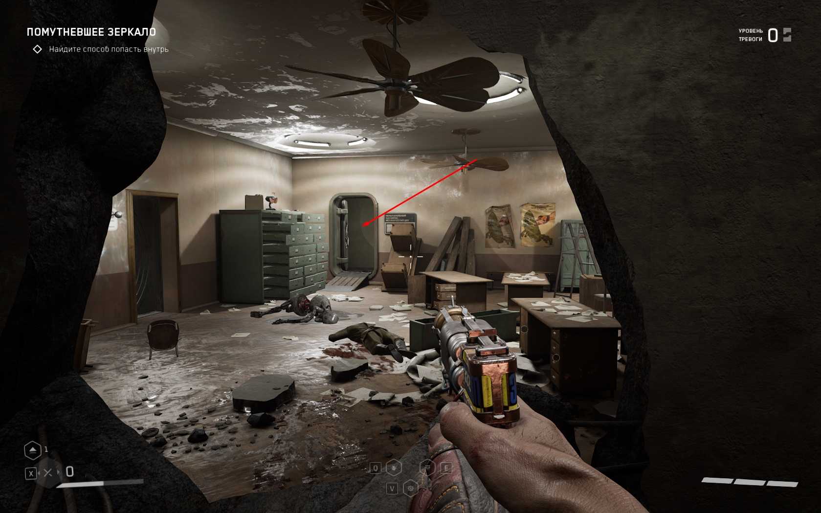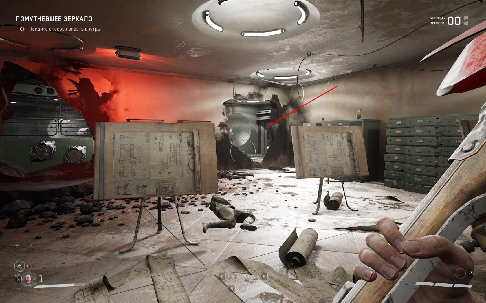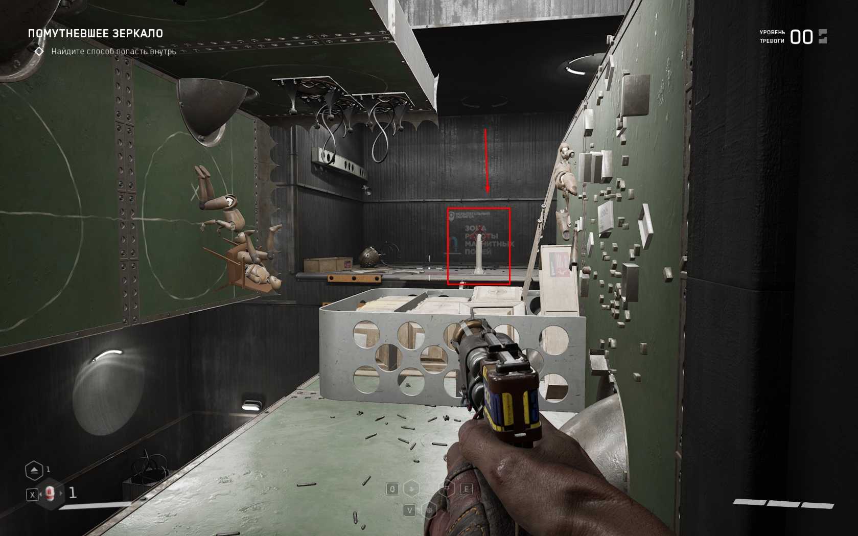 | 8 | Справа за дверью ничего нет, поэтому идите налево через пролом в стене. Там будет лестница и комната с Товарищем Лутягиным (чертеж «ПМ – увеличенный магазин») |   |